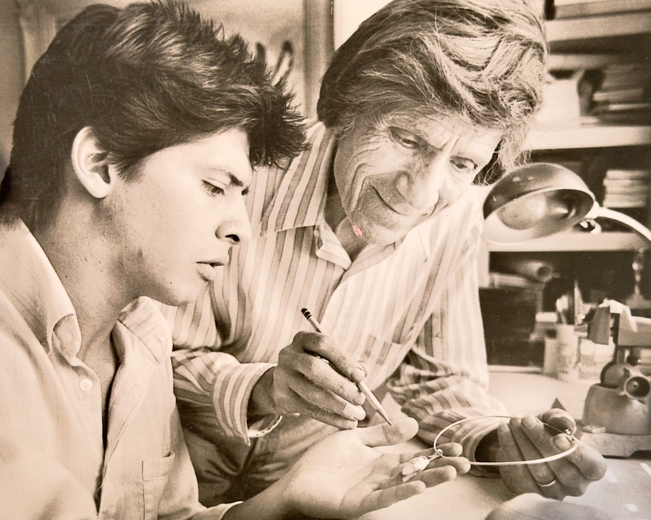 Here is a photo from around the 1980’s of two of the greatest jewelers of all time, Charles Supplee and Pierre Touraine. Charles Supplee was known for his contemporary Hopi jewelry, which Pierre helped Charles advance his jewelry-making techniques. My great aunt Lovena Ohl worked with Pierre for over five years. We met Charles, and he started showing his jewelry in the gallery. Charles wasn’t the only artist who worked with Pierre but other master jewelers like Charles Loloma, Harvey Begay, and Larry Golsh.