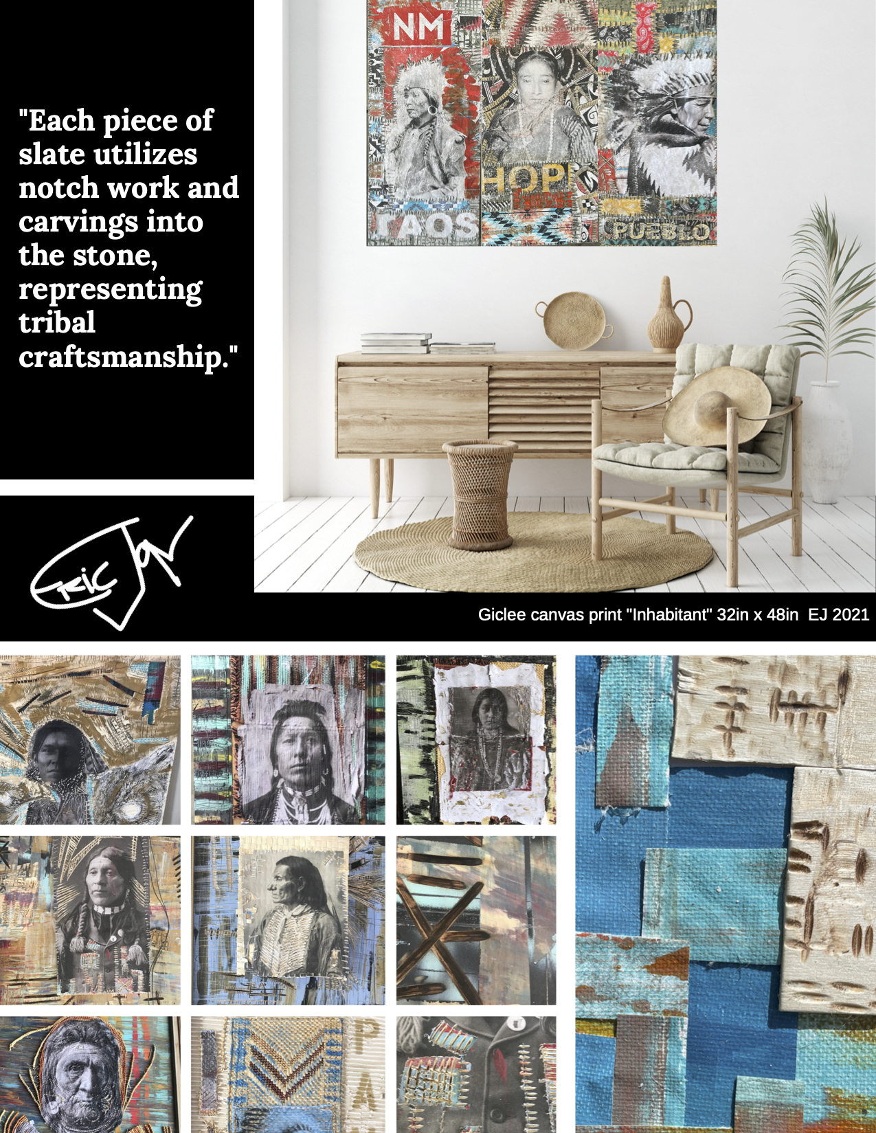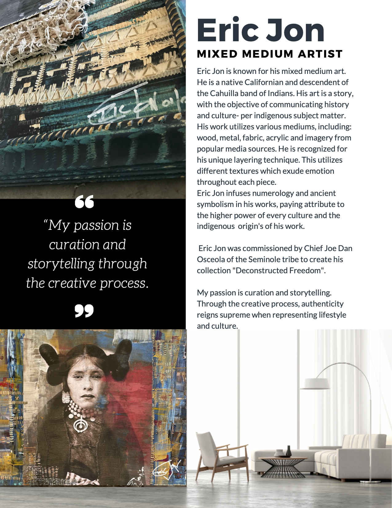 Eric Jon is known for his mixed medium art. He is a native Californian and descendent of the Cahuilla band of Indians. His art is a story, intending to communicate history and culture- per indigenous subject matter. His work utilizes various mediums, including wood, metal, fabric, acrylic, and imagery from popular media sources. He is recognized for his unique layering technique. This utilizes different textures which exude emotion throughout each piece. Eric Jon infuses numerology and ancient symbolism in his works, paying attribute to the higher power of every culture and the indigenous origins of his work. Eric Jon was commissioned by Chief Joe Dan Osceola of the Seminole tribe to create his collection “Deconstructed Freedom”. My passion is curation and storytelling. Through the creative process, authenticity reigns supreme when representing lifestyle and culture.