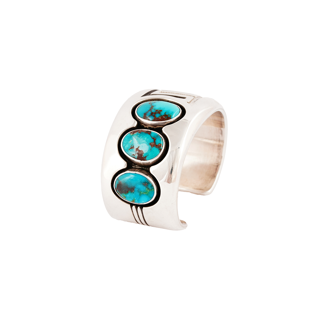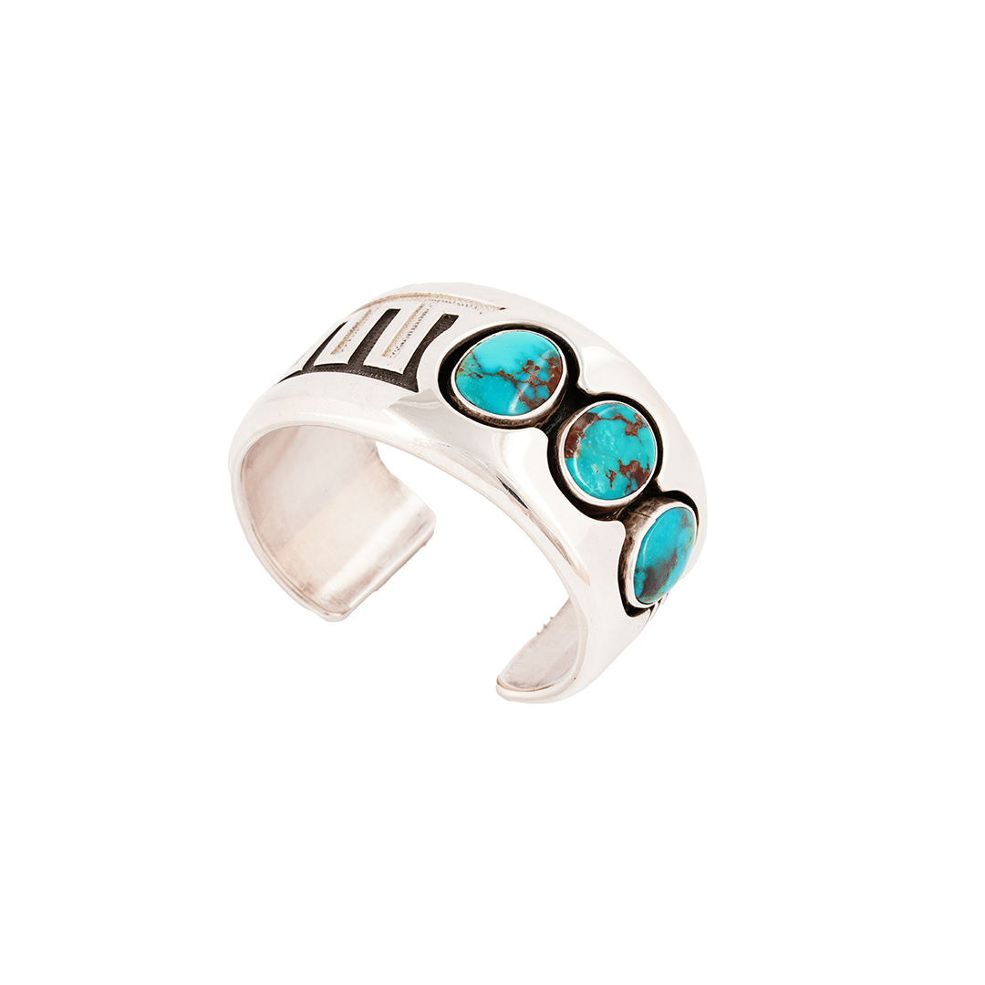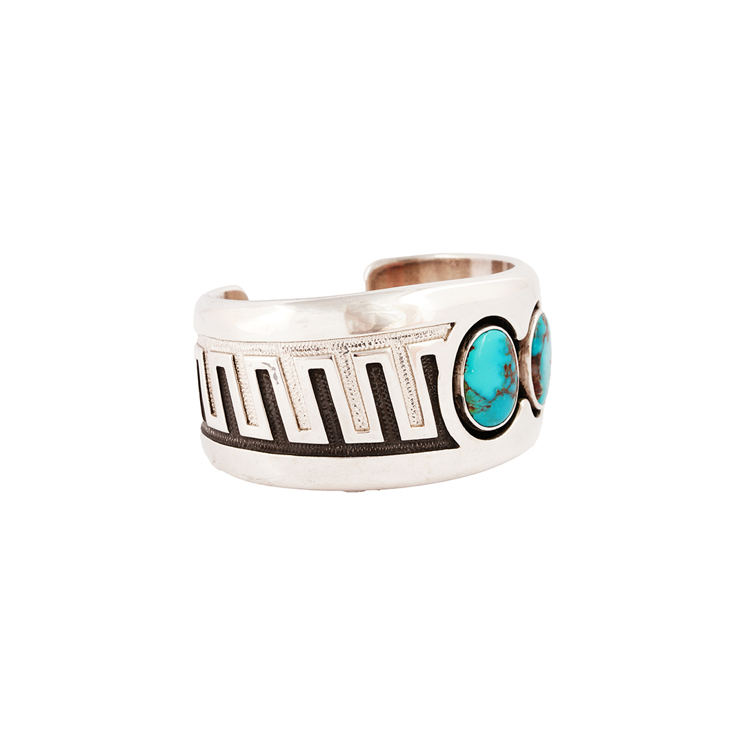 Dan A. Jackson (1944-2022) was a Navajo jeweler who had been active since the 1960s until his passing in 2022. Dan set these Bisbee turquoise stones in a shadow box design. This is a sterling silver contemporary-style design cuff bracelet.