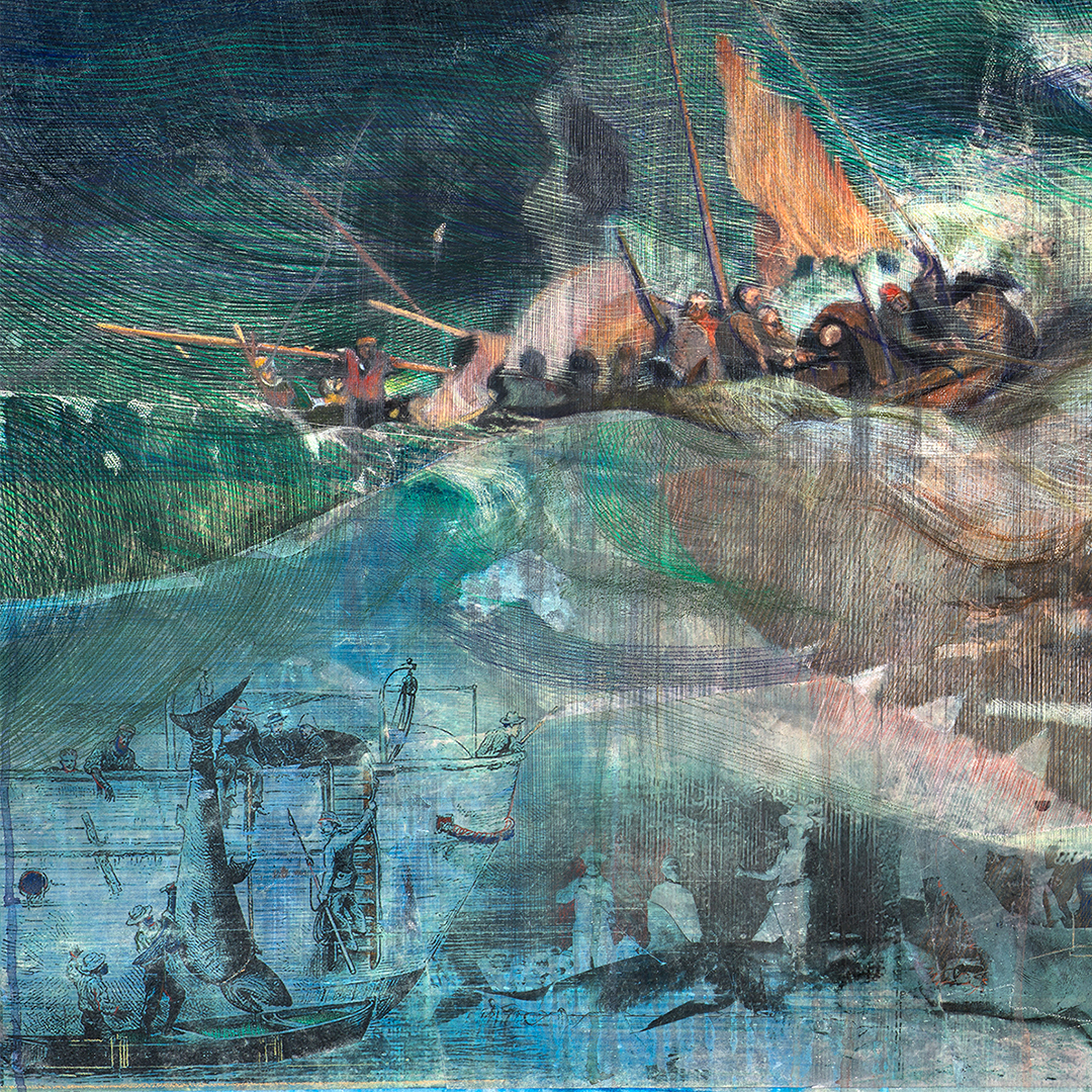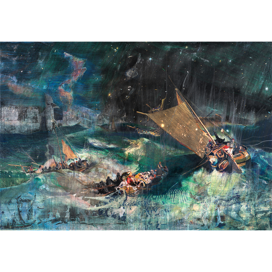 Adam Rake’s ‘World Lines: The Shipwreck (after JMW Turner)’ is a contemporary reinterpretation of JMW Turner’s 1805 painting. It recontextualizes the experience of being stranded at sea, a theme that was problematic in Turner’s era due to the dangers of maritime travel. Rake’s interpretation, however, is uniquely relevant to our modern world, where technological advancements can create a false sense of security and control over nature. This artwork delves into the delicate balance between humanity’s desire to dominate and exploit the natural world and our inherent vulnerability within it. As we increasingly detach from the natural rhythms, our hubris grows, making time and natural history seem insignificant. Yet, nature and evolution operate on vast timescales, far beyond individual human experience, reminding us that we are fundamentally a part of this dynamic ecosystem and cosmos and subject to its forces. Ultimately, this piece invites reflection on the humility that emerges from recognizing our place in time and the universe. In our most existential moments, we are. Still, a small fragment in an unfathomably expansive reality, urging us to reconnect with the awe and fragility of our existence within our environments.