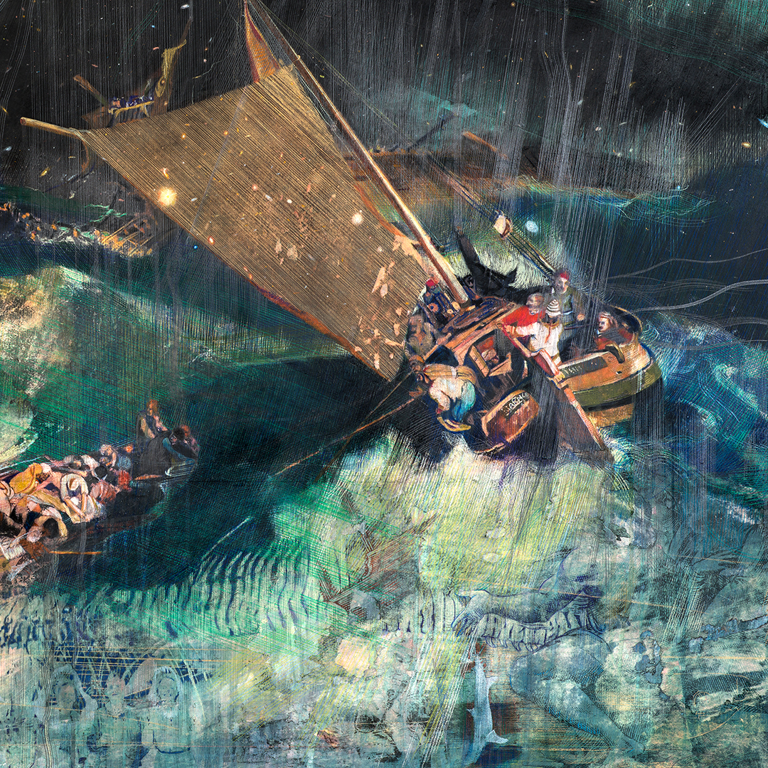 The figures in the boats appear frantic, which is in line with Rake’s focus on the human form. Some seem to be rowing with desperation, others clinging to the vessels, all struggling against the chaotic forces of wind and sea. The lines of the waves are almost abstract in places, their brushstrokes creating movement and texture that suggest both the fury of the elements and the broader existential threat they pose to human survival.
