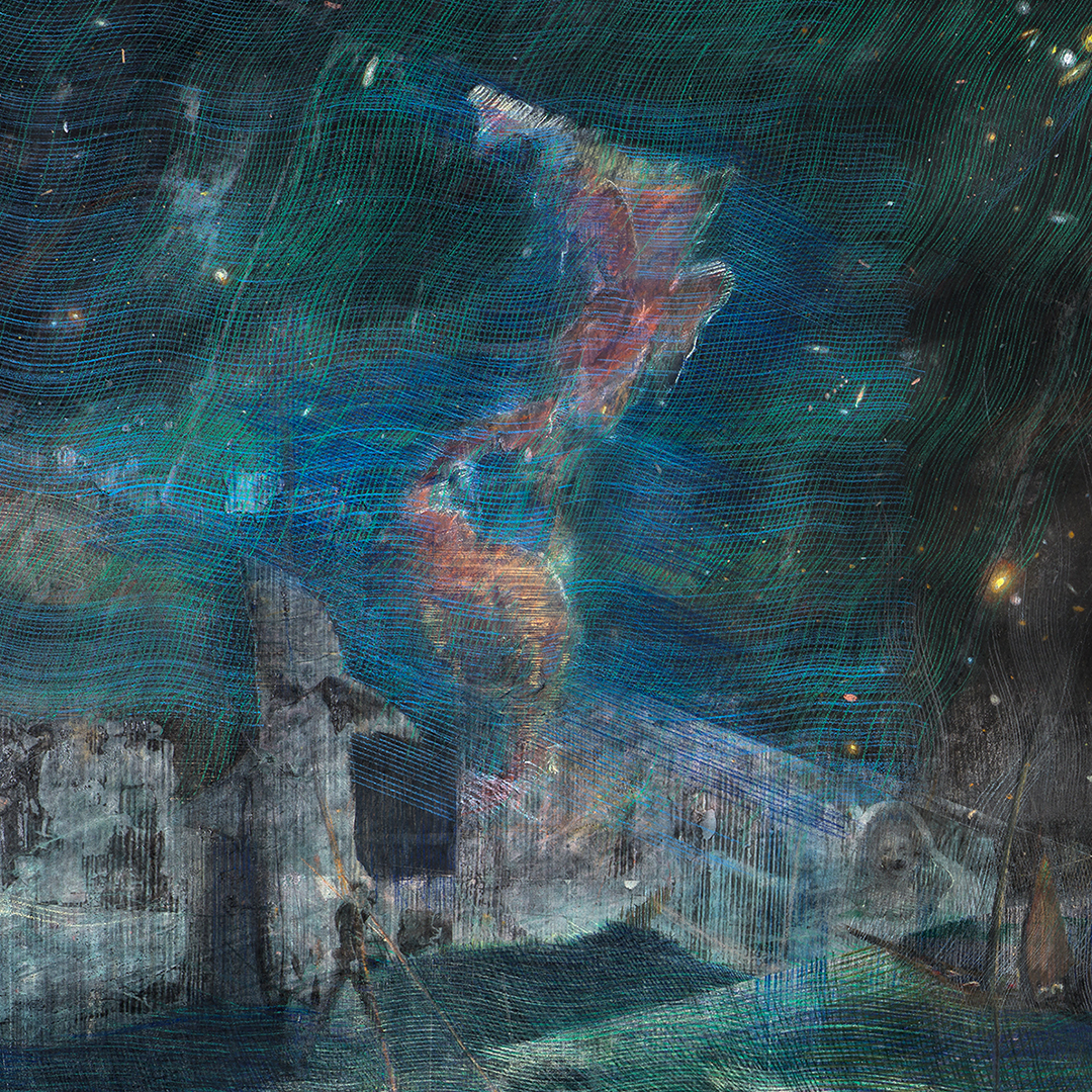 The background blends more abstract elements, such as a ghostly structure, a representation of ruins, or a distant shore with a roiling sky. Stars and streaks of light in the night sky suggest a celestial or cosmic dimension to the scene.