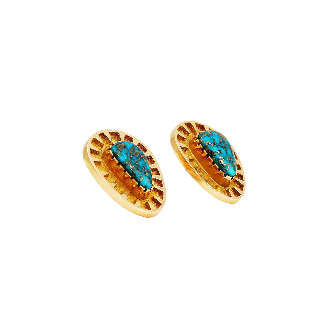 Al Nez is a self-taught Navajo jeweler who has spent most of his career tufa casting. Al made these 14k gold earrings from tufa stone and cast them in gold. He added high-grade Morenci turquoise stone and set them in a gold serrated bezel. Over the years, Al has won numerous awards for his Navajo-style jewelry. These are post-earrings but can be converted to a clip.