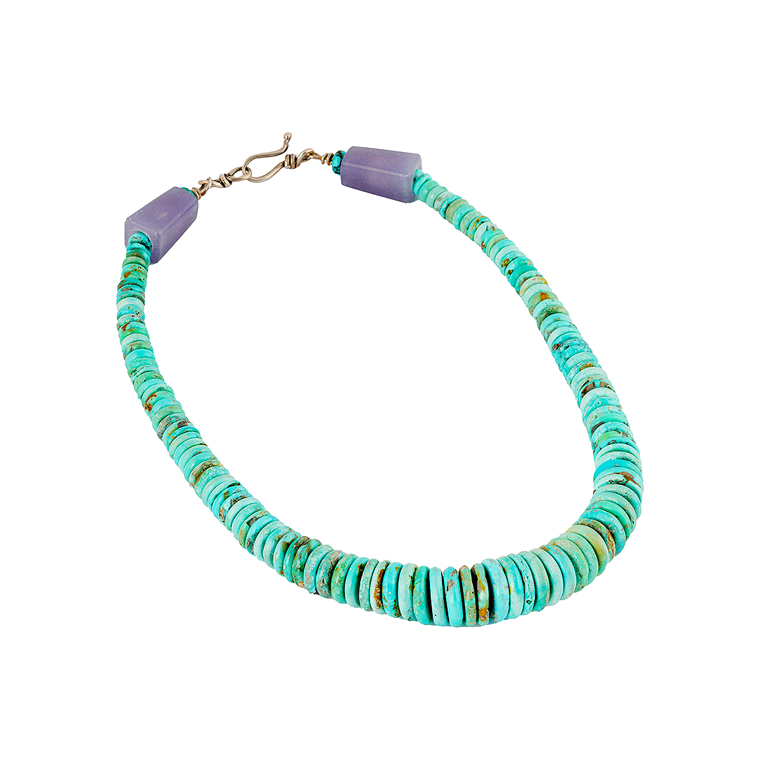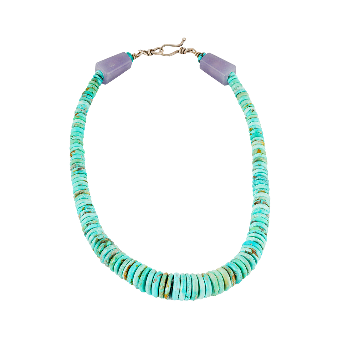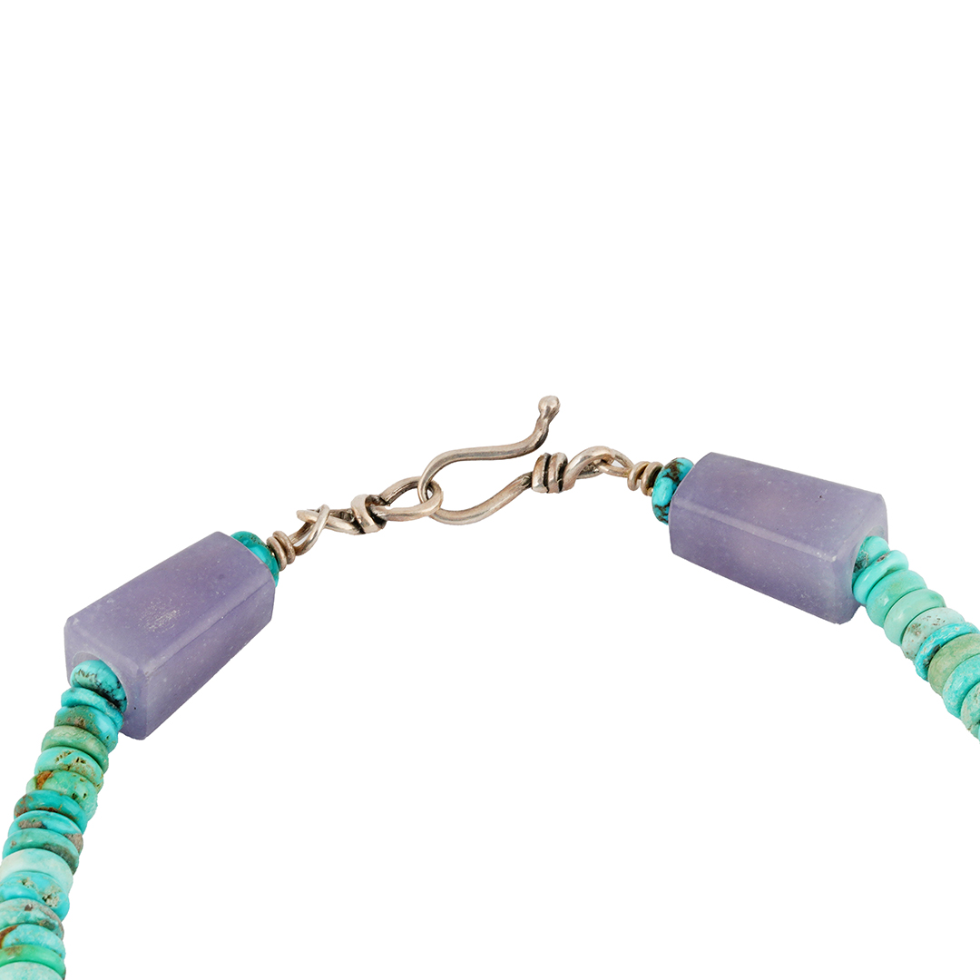 Graduated hand-rolled natural turquoise beads by Bruce Eckhardt. He has been one of the beads bead rollers for over thirty years. He added two calcedony end caps, a hand-made sterling silver chain, and a hoop clasp.