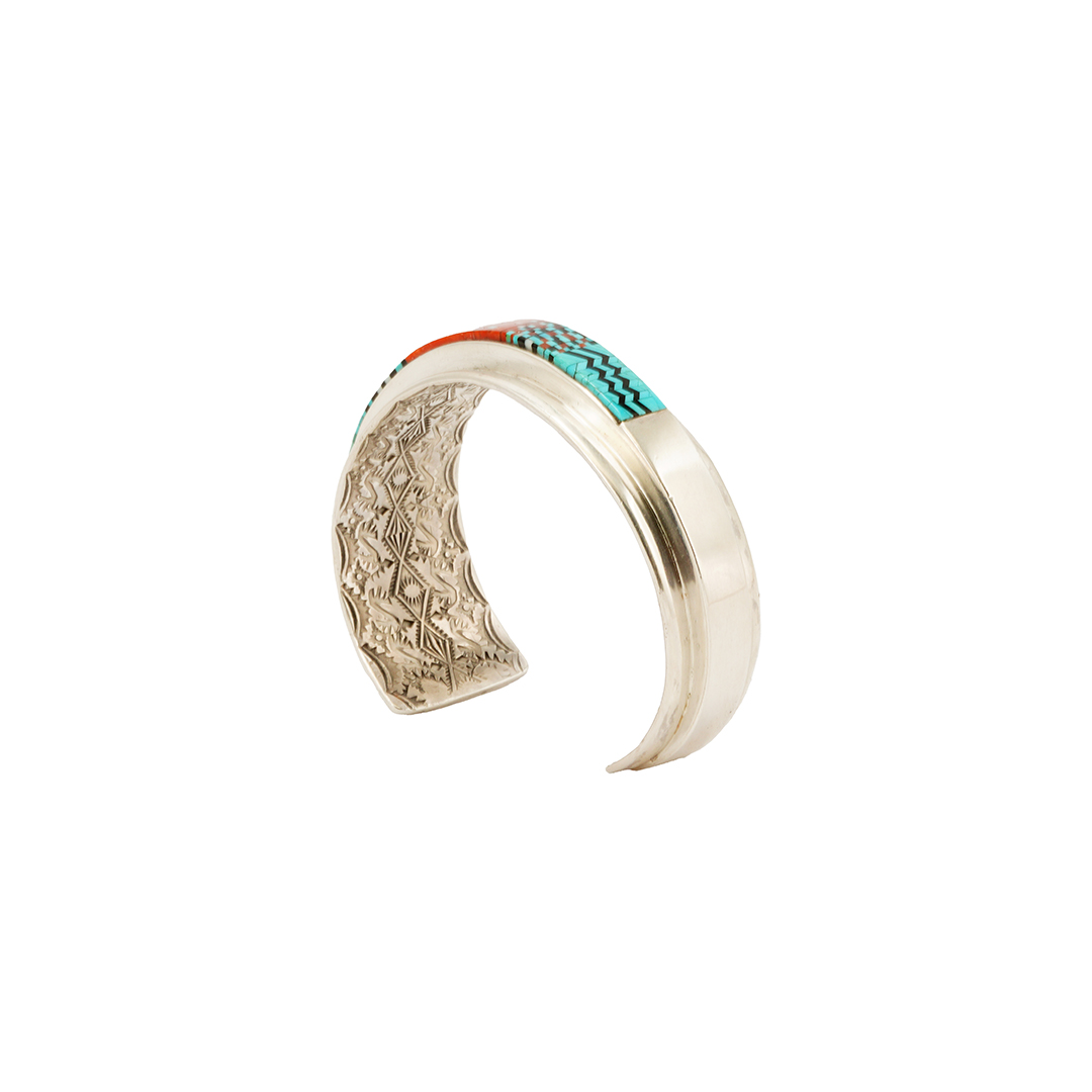 This is a hand-fabricated sterling silver bracelet. All the metalwork is hand-made by Irene, while Carl cuts and sets the micro-fine inlay, which sets these two apart in this jewelry style. This bracelet is inlaid with turquoise, coral, jet, and mother of pearl. The inside of this silver bracelet features hand-stamped design elements.