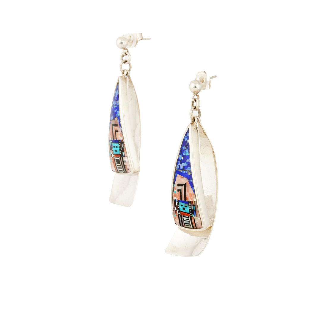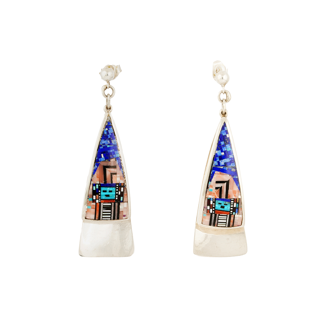 The Clarks have been making jewelry since the 1970s. Together, they focus on meticulously cutting micro-inlaid stones. Carl cuts 100s-1000s of stone depending on the size of the piece’s arranging colors to create their design, like sterling silver, coral, jet, and mother of pearl. The image on these post earrings is a Navajo Yei, a classic design the Clarks use in their jeweler. Irene makes all the metalwork, which is slightly domed, which adds to the complexity of inlaying these dangle earrings.