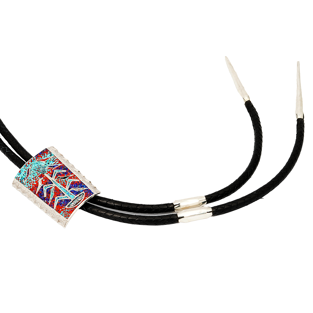 Carl Clark is responsible for the precise micro-inlay work, where each stone is cut and set with remarkable accuracy under magnification. Irene Clark, his wife and creative partner, fabricates the sterling silver components entirely by hand, including the bolo setting, custom tips, and accent spacers, all of which are mounted on a high-quality braided black leather cord.