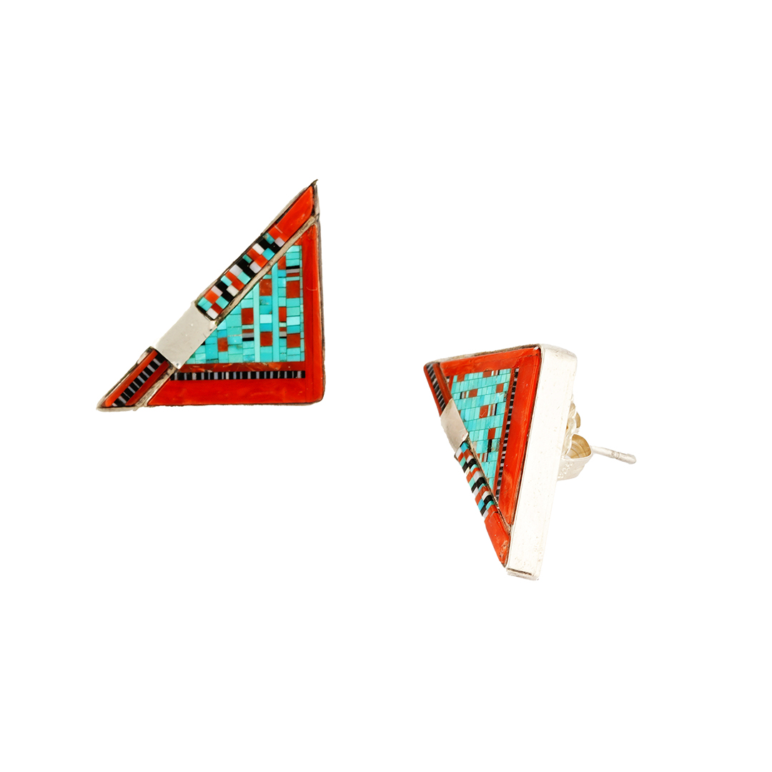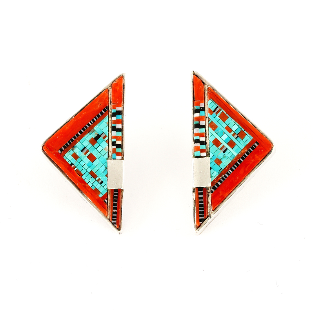 These sterling silver earrings, made and dated 1984, are by Navajo jewelers Carl and Irene Clark. The Clarks started making jewelry in the mid-1970s, focusing on micro-inlay. Silver earrings are inlaid with coral, turquoise, jet, and mother of pearl. The Clarks sign these earrings on the back with their Hallmark. They are post earrings.
