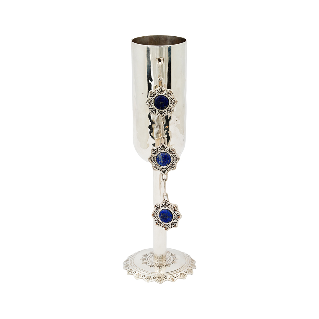 Carlon, a Navajo and Hopi jeweler hand, made this sterling silver fluted champagne glass with a three-stone denim lapis dangle. He hand-stamped the silver base, adding design to the silver glass.