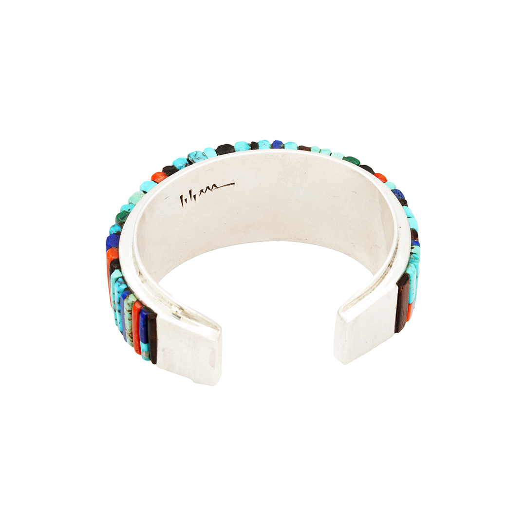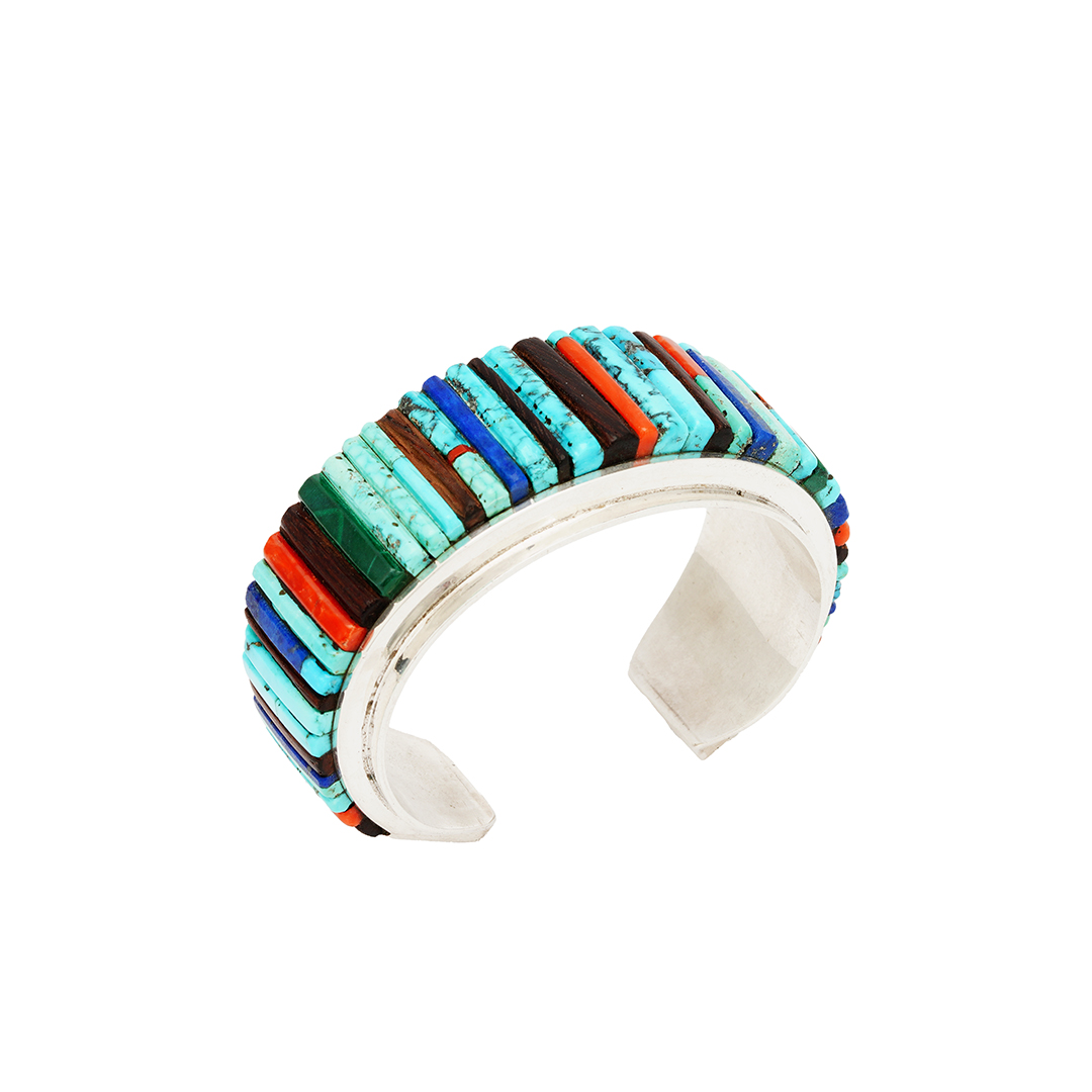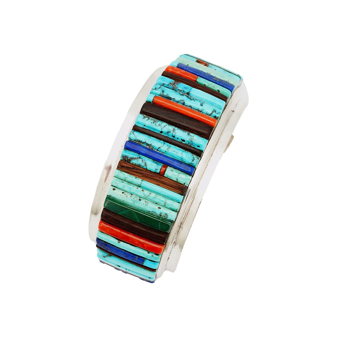 Charles Loloma is recognized as the father of contemporary American Indian Jewelry today. It wasn’t until the 1950s Loloma created jewelry. This sterling silver bracelet was made in the 1970s, and Charles called it his “Corn Row” style. The Hopis have a strong connection to corn, which Charles cut and inlaid the turquoise, lapis, coral, and ironwood to resemble stylized kernels.
