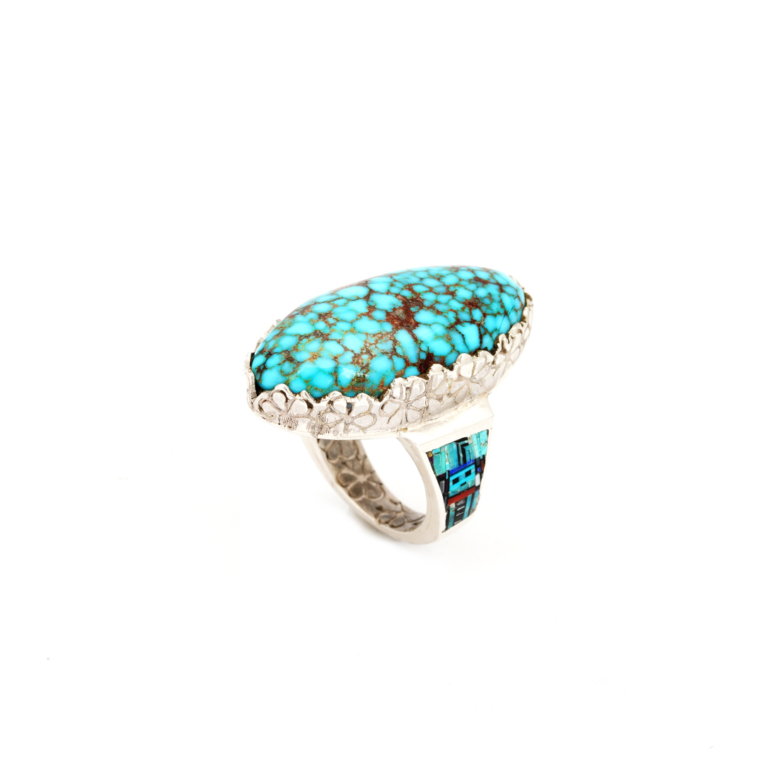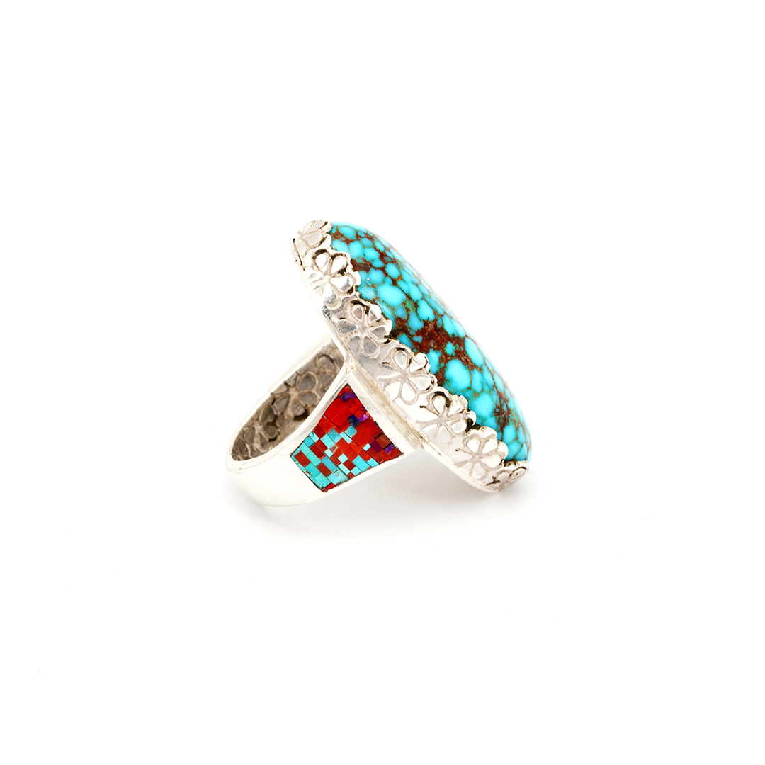 High-grade Kingman turquosie stone in sterling silver hand-stamped floral design bezel on a sterling silver ring by Navajo jewelers Carl and Irene Clark. This isn’t a typical style ring for the Clarks, with their primary focus on the micro-inlay, which this ring still features. On one side, you see the classic Navajo Yei design in turquoise, coral, lapis, jet, and mother of pearl. On the other side, they added a mosaic of coral, turquoise, and lapsi lazuli, which made Carl and Irene known. On the inside, Irene, who designs and makes the metalwork, added more hand-stamped floral designs. Her husband, Carl, cuts and inlays all the mice-fine inlay stones.