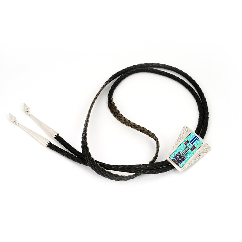 This bolo tie showcases the signature micro-inlay work of Carl and Irene Clark, renowned for their intricate and highly detailed Diné (Navajo) jewelry. They are artists recognized for using tiny, hand-cut stones to create vibrant mosaic images, often inspired by traditional Navajo symbolism and stories. Frequently employing hundreds of individually shaped and set stones, their pieces are technically astonishing and spiritually meaningful, such as this sterling silver tufa cast bolo tie featuring a stylized Navajo Yei design. Tufa casting involves etching and carving in tufa stone, a volcanic rock that takes the shape of the metal once the molten metal is poured into the design.