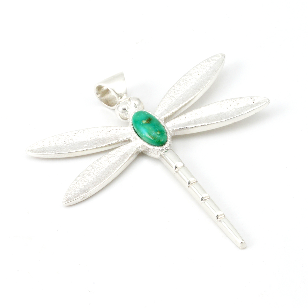 Sterling silver dragonfly pendant by Darryl Dean Begay with single turquoise stone.