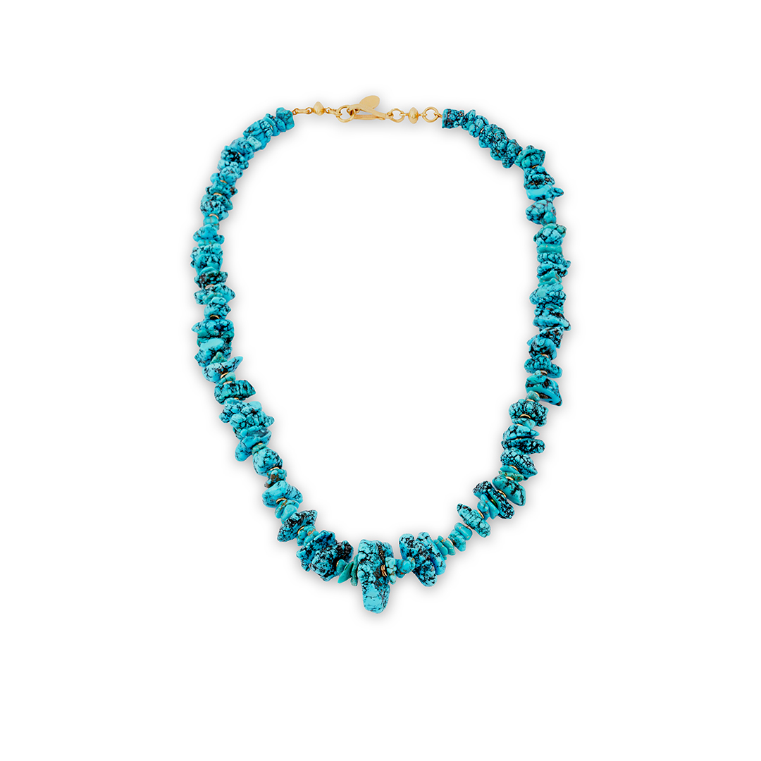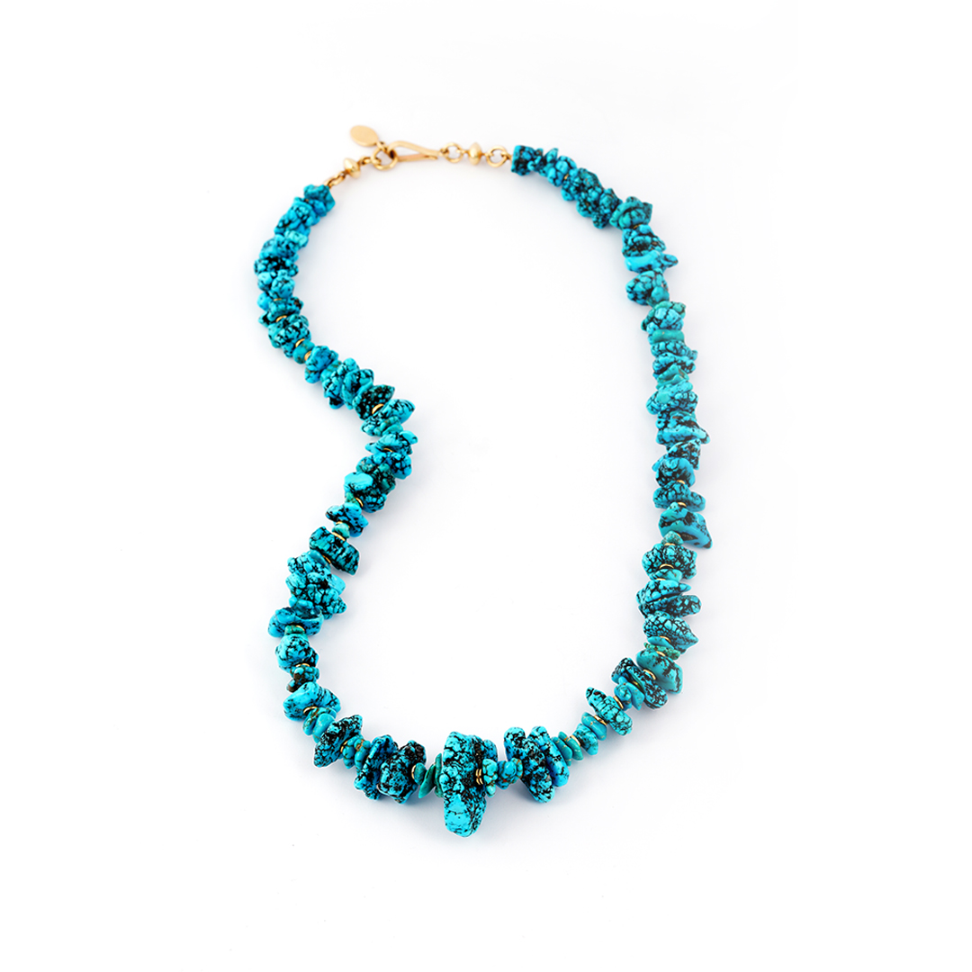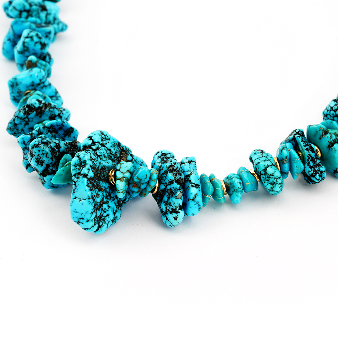 This is a genuinely stunning turquoise nugget necklace by Don Supplee. Don added fine gold disk spacers throughout this necklace and finished it with an 18k handmade gold clasp. The turquoise is gem-quality Lone Mountian turquoise nuggets.