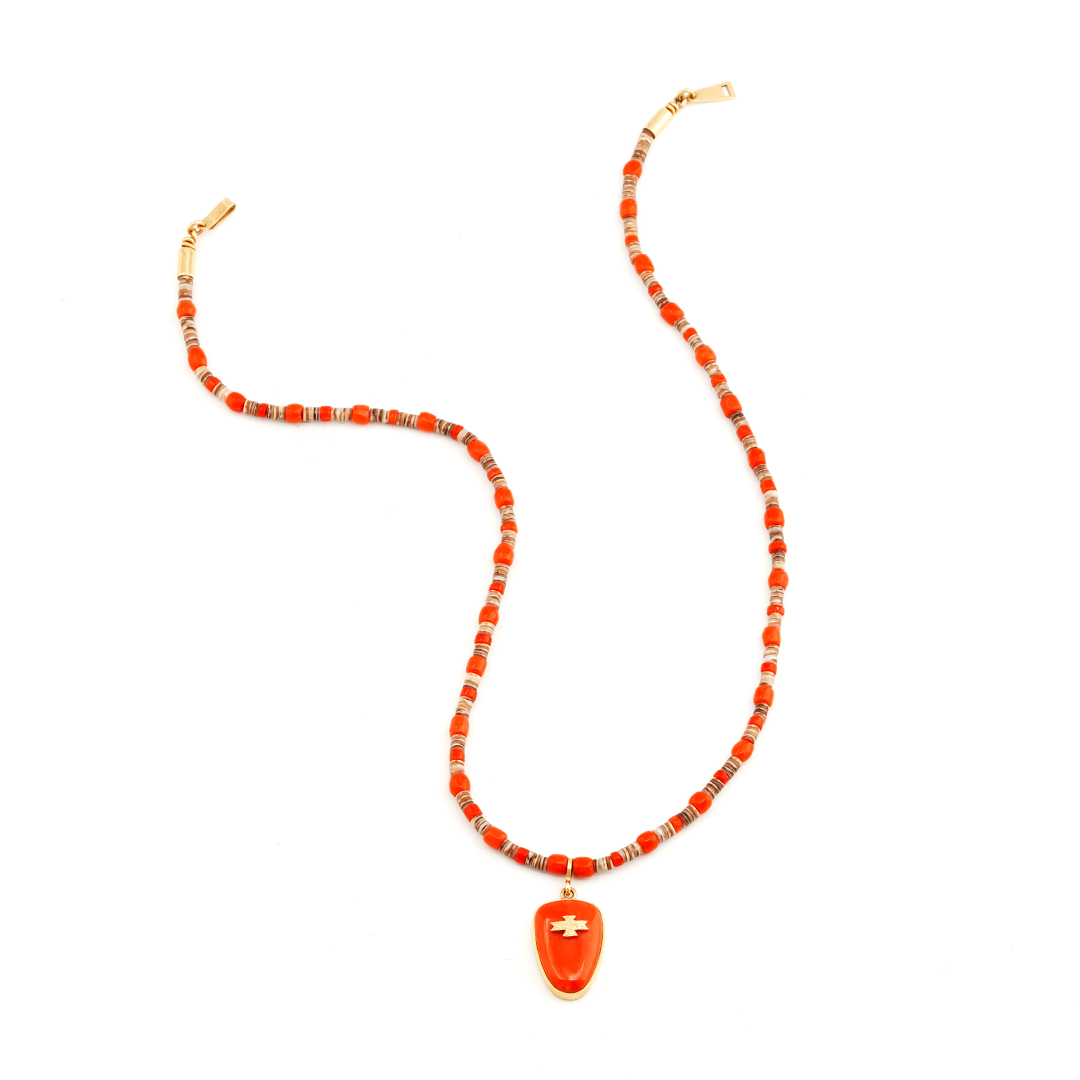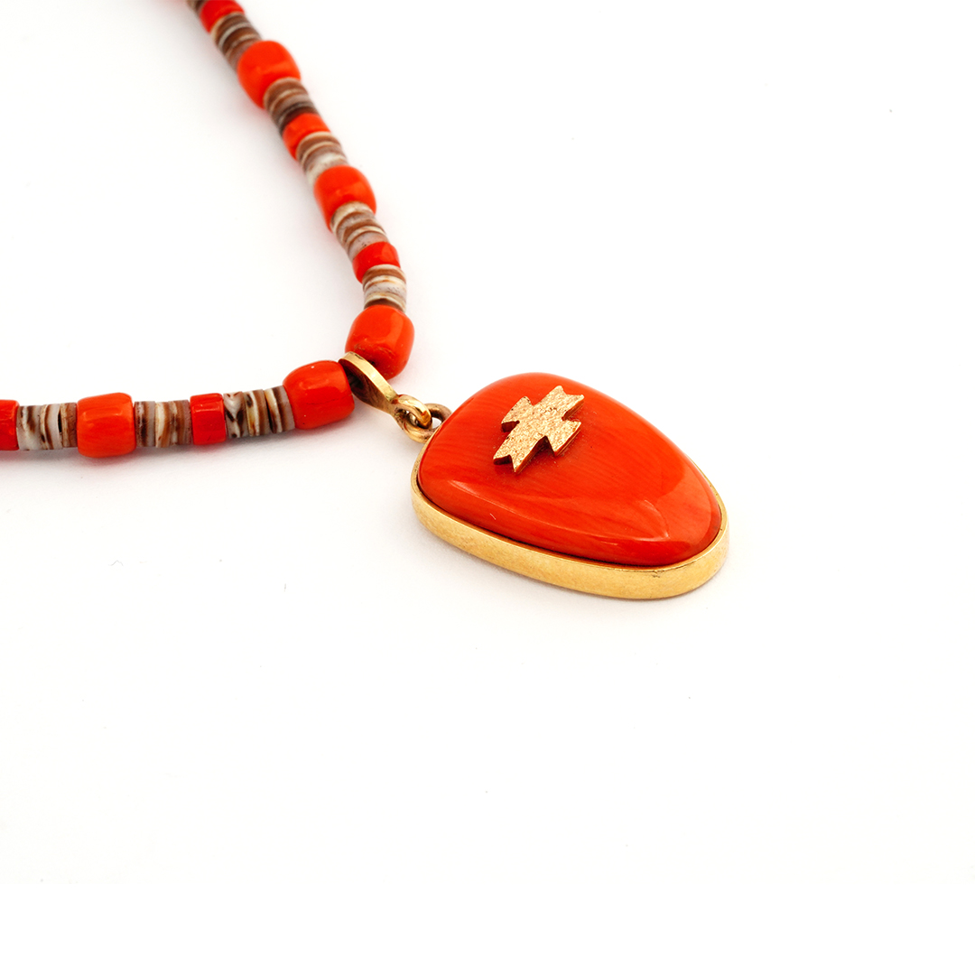 Master Navajo jeweler Harvey Begay, a flight officer and test pilot for the U.S. Navy, followed in making jewelry in his father’s footsteps (Kenneth Begay). He made this coral and heishi necklace with a 14k gold coral pendant. Harvey accented this coral pendant with an inlaid tufa cast gold rug design.