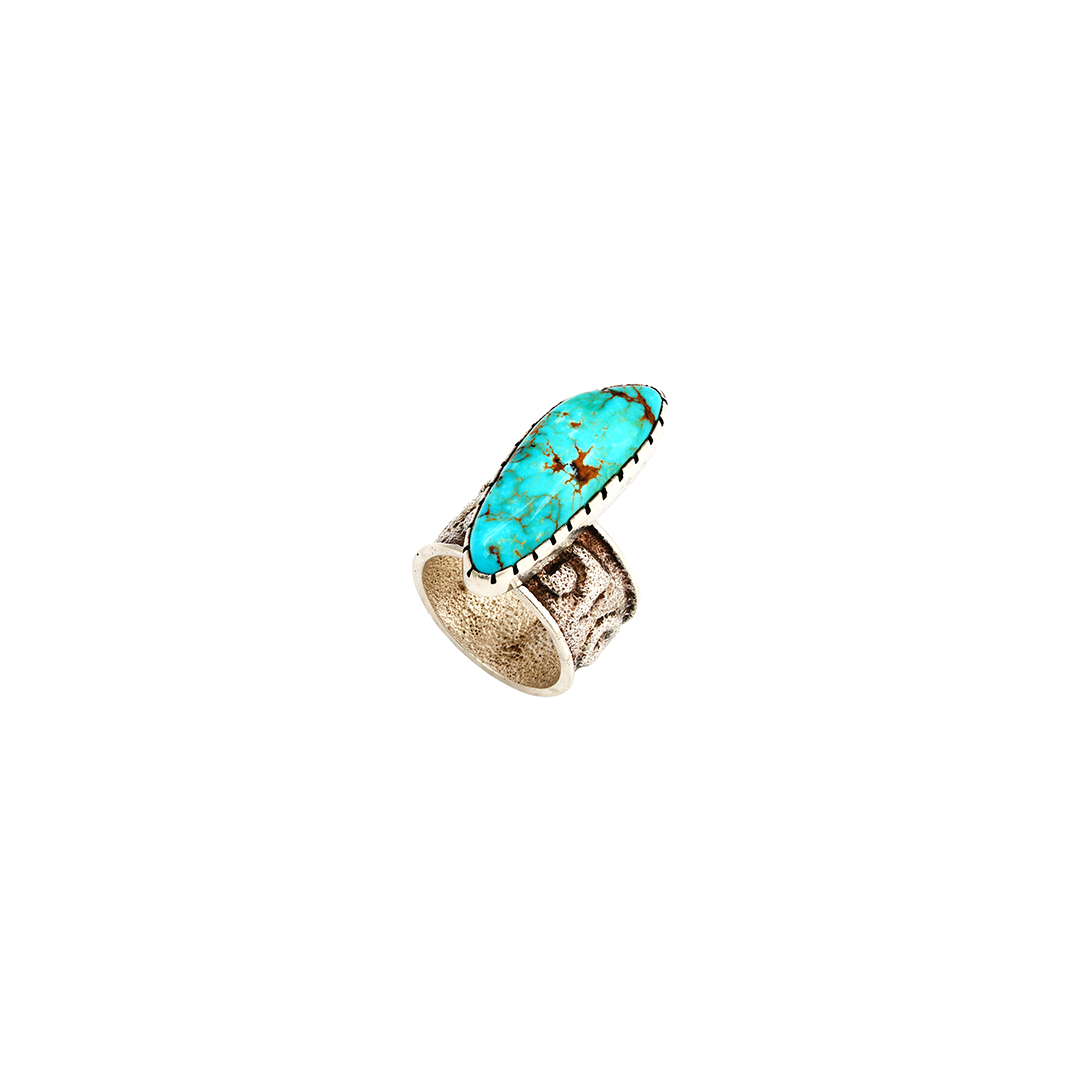 Sterling silver tufa cast ring by Navajo jeweler Harvey Begay. Harvey set this ring with a piece of Tyrone turquoise stone.