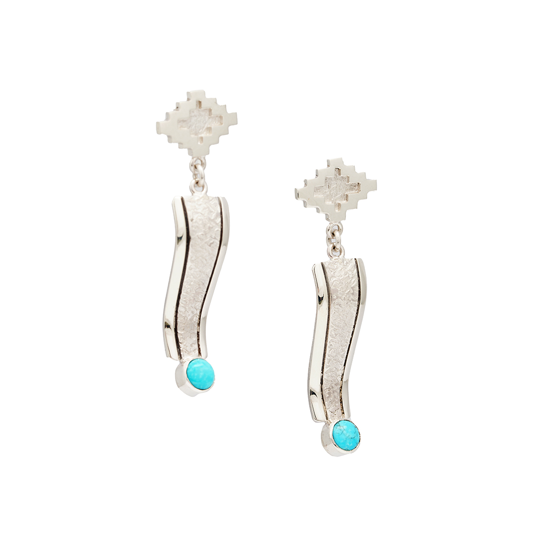 These sterling silver dangle earrings, handmade by Navajo silversmith Jonathan Mike, feature turquoise stones on the dangles. He designed them using elements from Navajo rugs. They are post-and-singed with “JM”, Jonathan Mike.