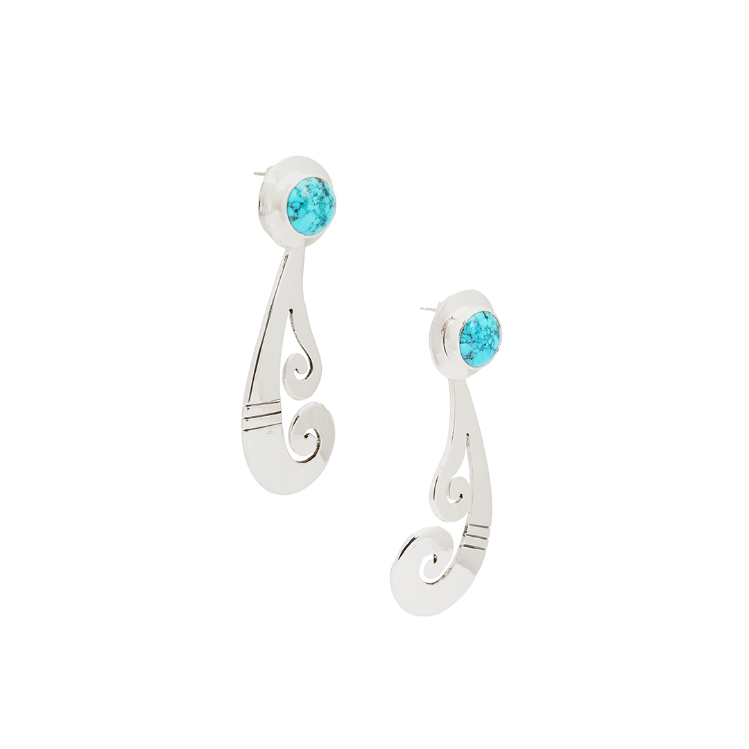 Navajo jeweler Jonathan Mike created these handmade sterling silver earrings. He stylized them after designs from the White Hogan, where he worked for many years. Above the silver dangles, he added Kingman turquoise stones. The backs are post, and he signed them “JM,” Jonathan Mike.