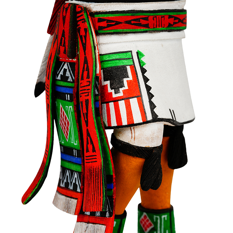 Wilmer Kaye is a Hopi carver known for his finely detailed and spiritually significant Katsina (Kachina) dolls, particularly those that preserve traditional Hopi carving techniques and ceremonial accuracy. Wilmer shows an excellent example of his work—a Hopi Eagle Dancer Katsina, which carries deep cultural and spiritual meaning in Hopi tradition. He hand-carved this Kachina out of the cottonwood root, achieving great detail through carving and painting perfectly balancing his sculpture. He signed the bottom “Wilmer Kaye.”