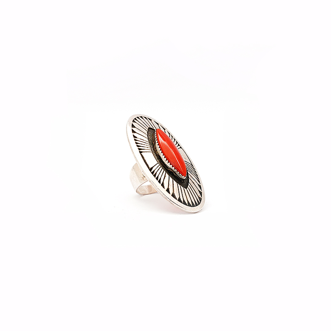 Kee Nez, a Navajo jeweler, made this sterling silver with blood red mediteranian oval coral ring with a center stone. He hand-chiseled the detailed feather design onto this ring.