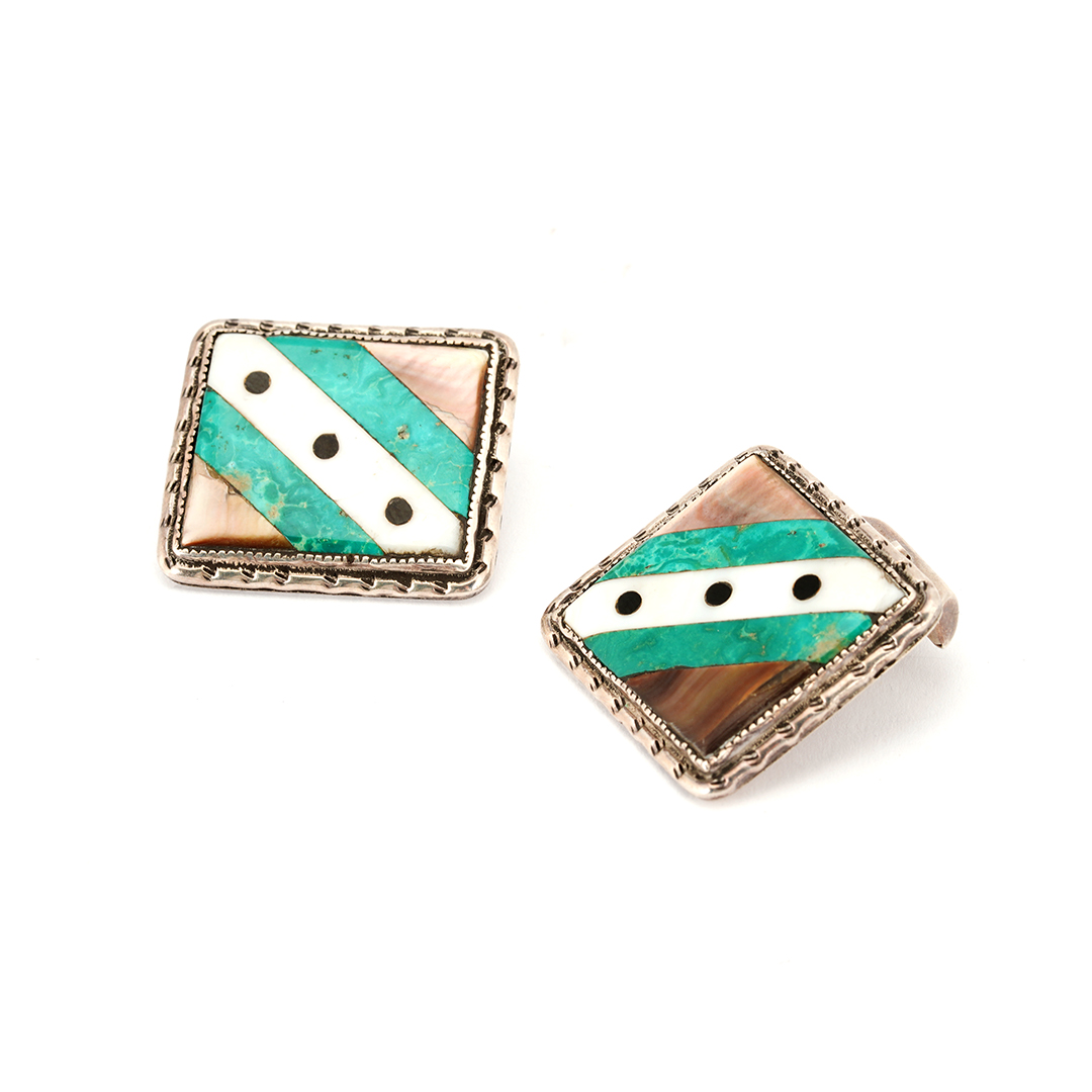 These sterling silver cuff links came from the C.G. Wallace collection. These are cuff links inlaid with turquoise, mother of pearl, shell, and onyx by Mary Kallestewa.
