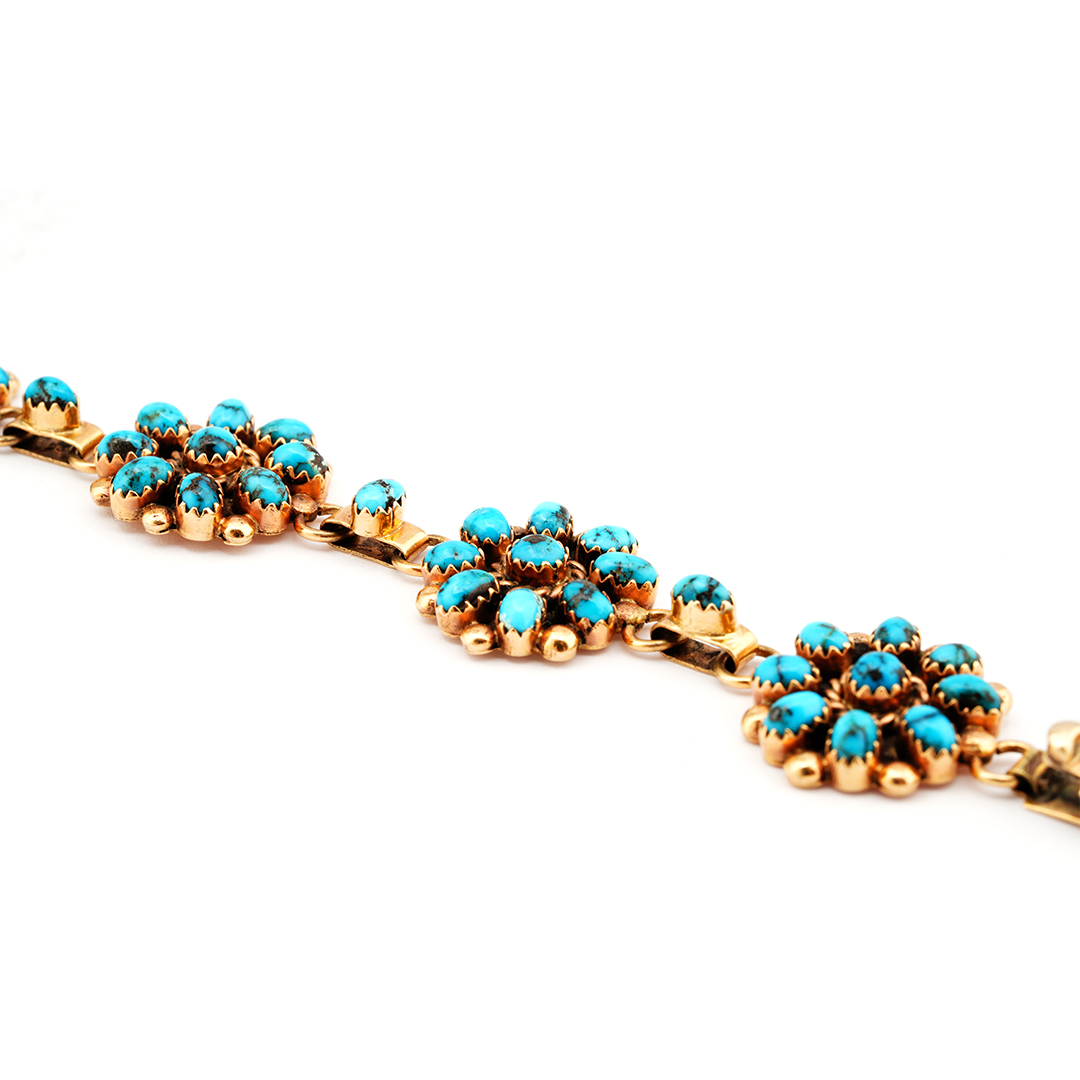 Beautiful 14k gold link bracelet by Navajo jeweler Mary Marie. She set each link with Persian turquoise stones.