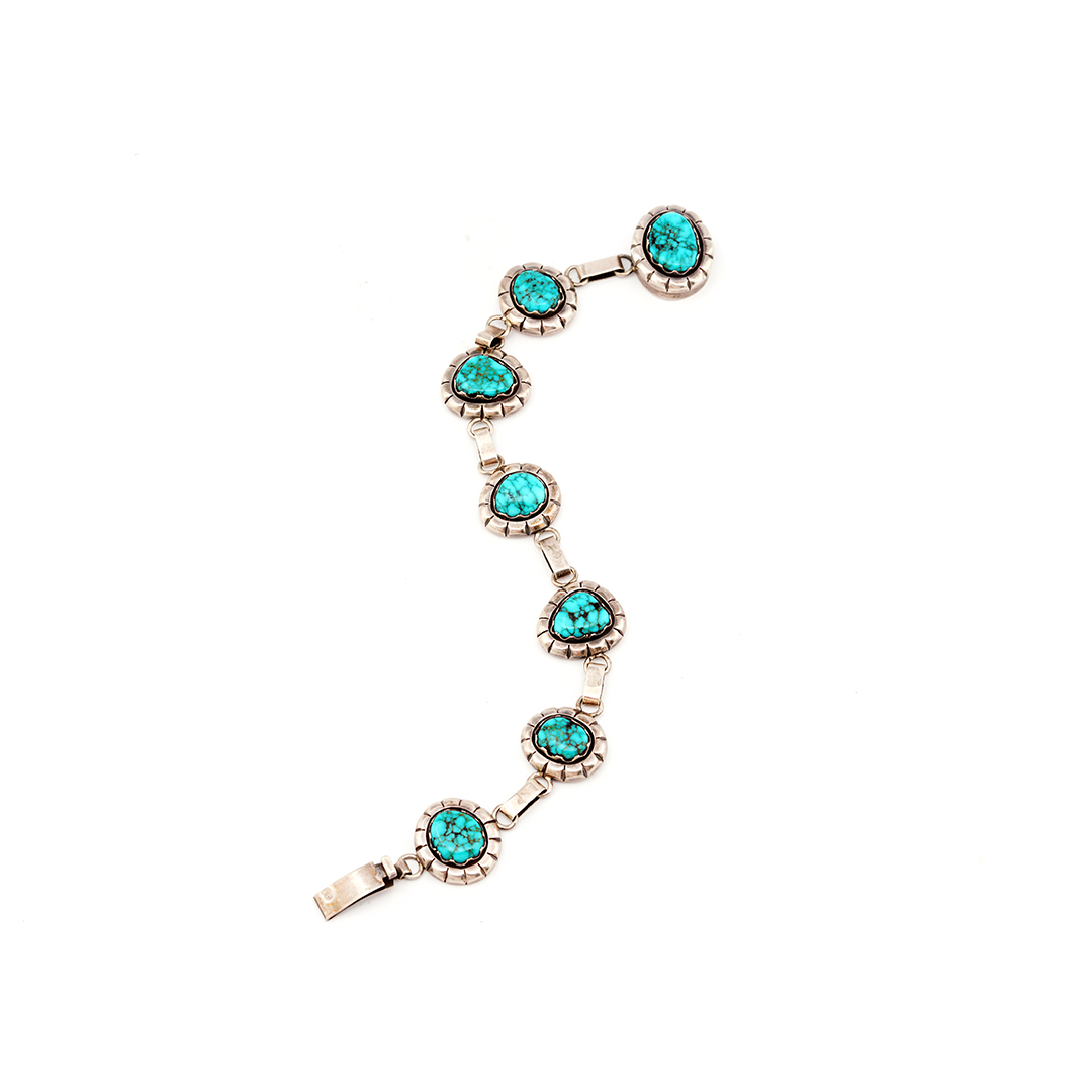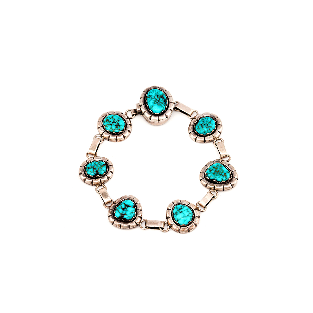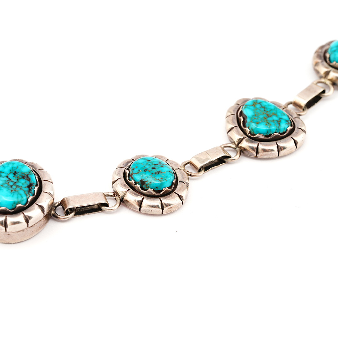 Mary Marie created this Navajo-style link sterling silver bracelet. She set the silver links with Lone Mountain Turquoise stones.