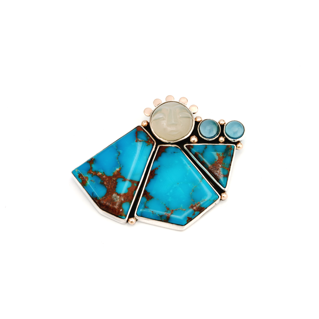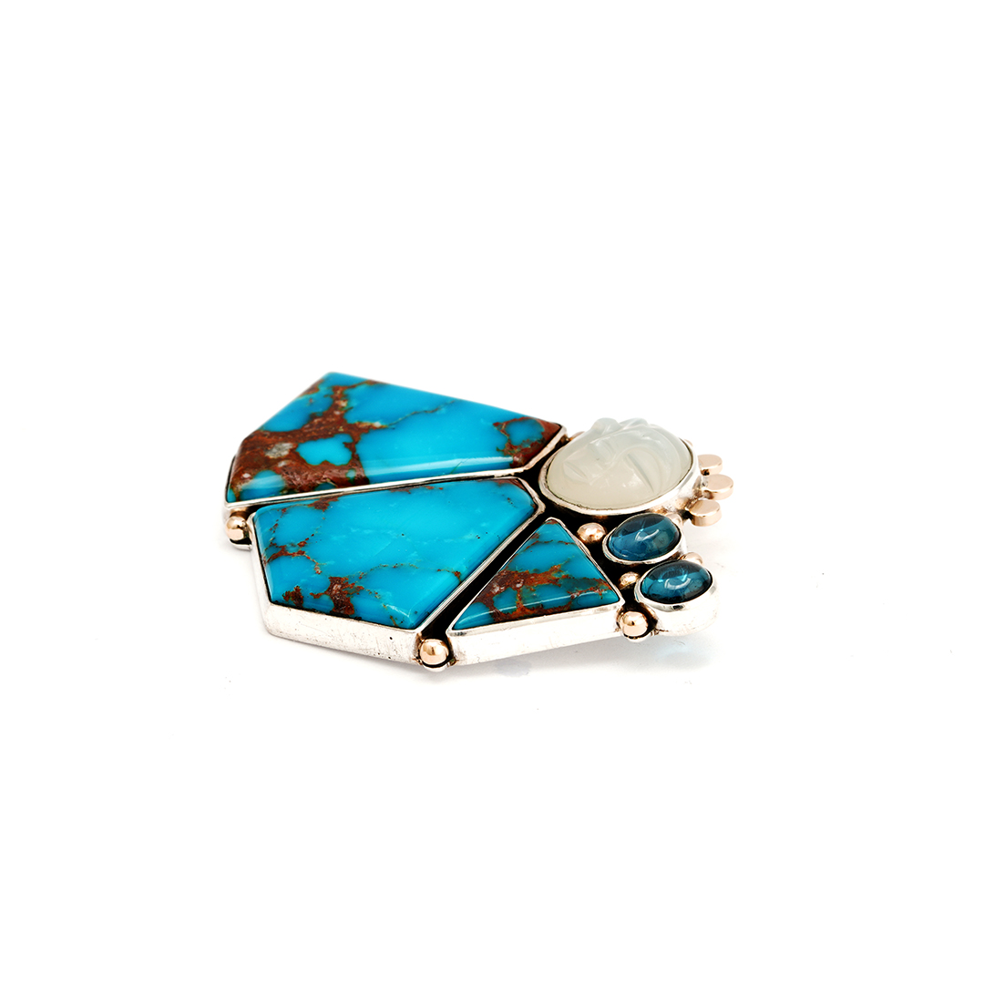 This is a sterling silver pendant with a hand-carved face in moonstone by Mike Bird Romero. There are 45 carats of Bisbee turquoise accented by two blue tourmalines. The 14k gold dots are a stylized headdress on top of the figure’s head with more gold dots spaced throughtout the figure. Mike left the backs of the moonstone and tourmalines open to allow light to shine through. This would be beautifully paired on a chain, neck wire, or leather cord. Mike signs his jewelry with two bird hallmarks.