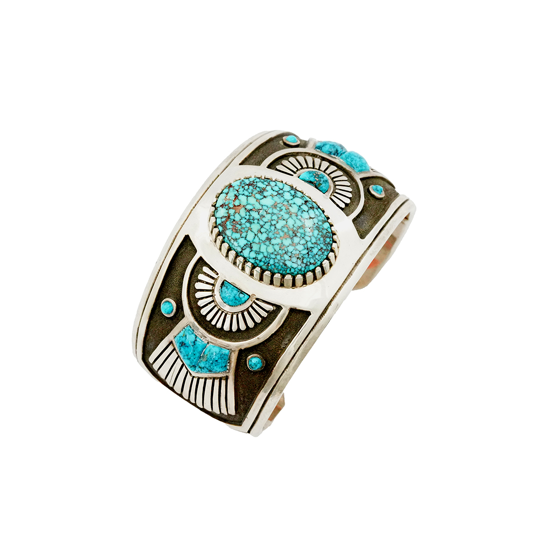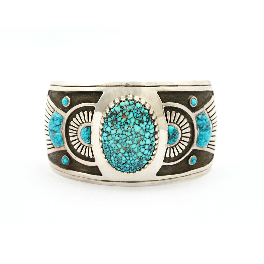 Michael Perry is a Navajo jeweler with a creative edge to his designs. This bracelet has a large center stone in a serrated bezel with ten accented turquoise stones.