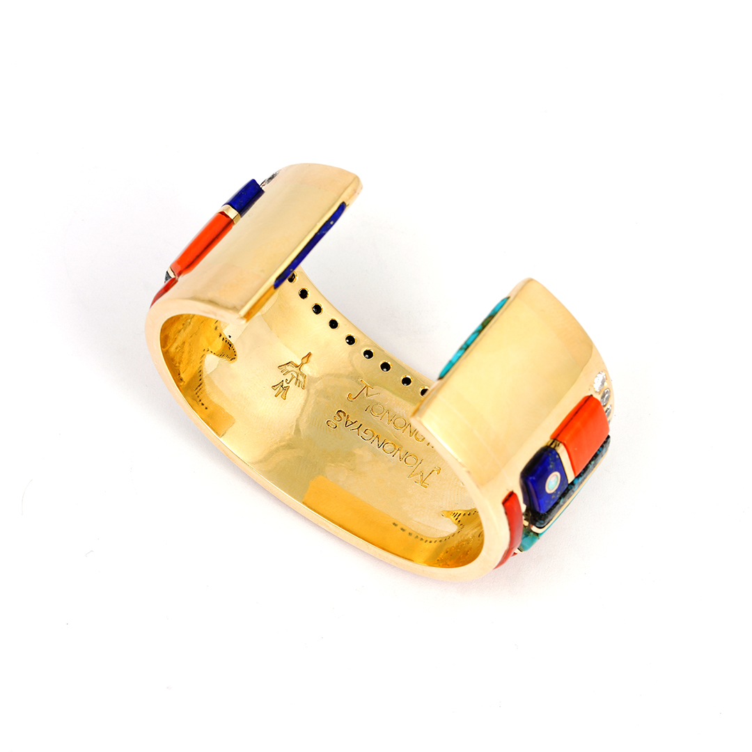 A turning point in his life came in 1975, when Monongya reunited with his biological father—renowned Hopi jeweler Preston Monongye. Under his father’s mentorship, Jesse began refining his craft, combining Hopi-inspired design sensibilities with Navajo symbolism and a unique vision all his own.