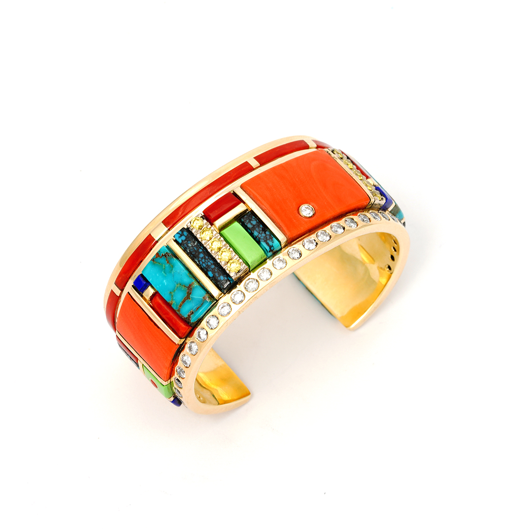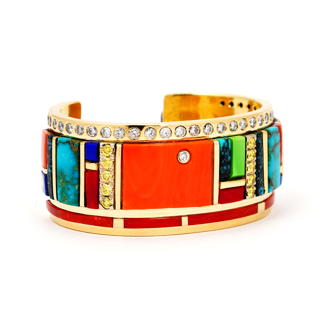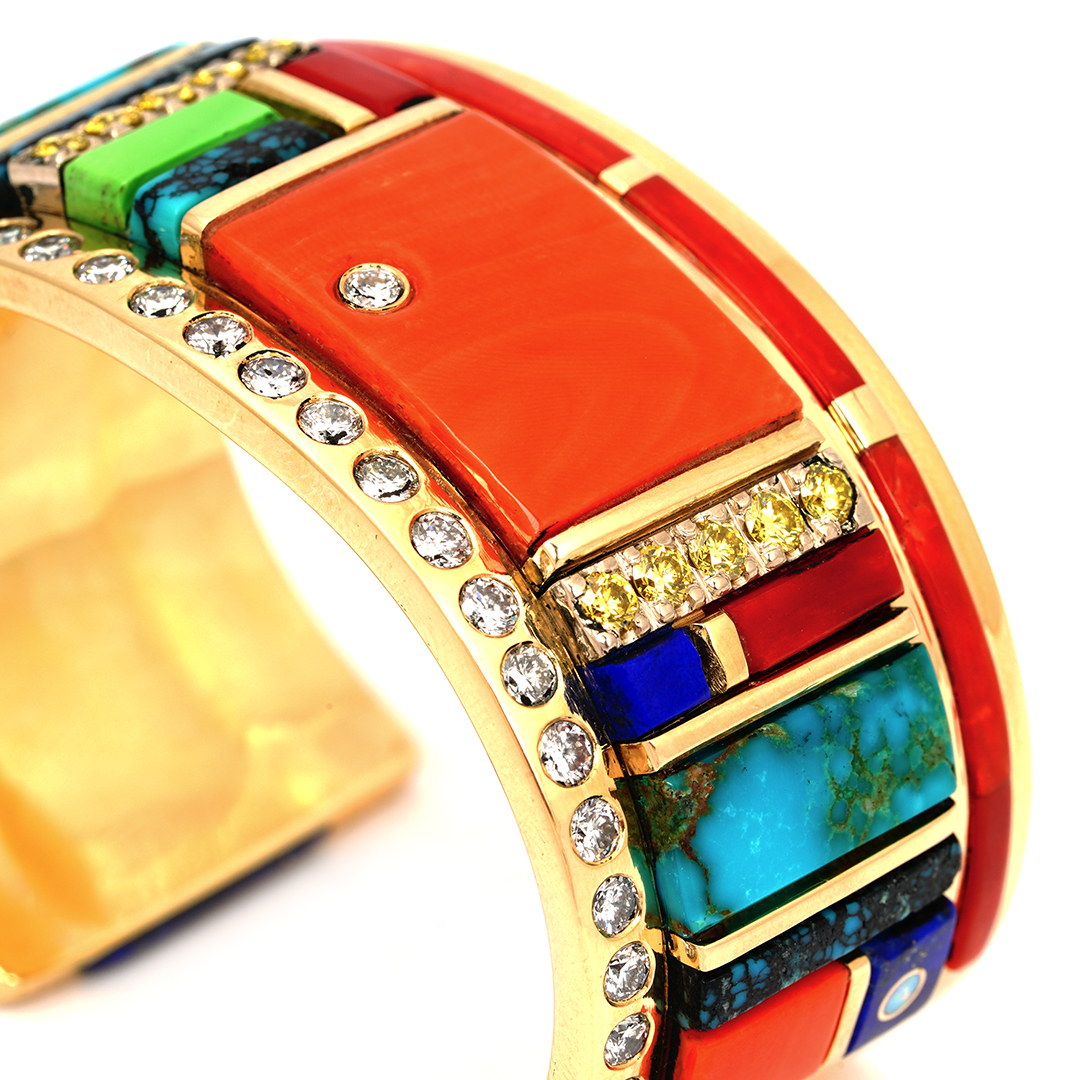 Monongya’s work is best known for its cosmic themes and masterful stone-to-stone inlay technique. Using materials such as lapis lazuli, turquoise, coral, opal, and fossilized ivory, he created wearable landscapes, spiritual motifs, and celestial symbols. His signature bear pendants, symbolizing strength and protection, became some of his most iconic creations. These intricately inlaid bears often featured stars and planetary elements set against jet or dark backgrounds, evoking the cosmos.