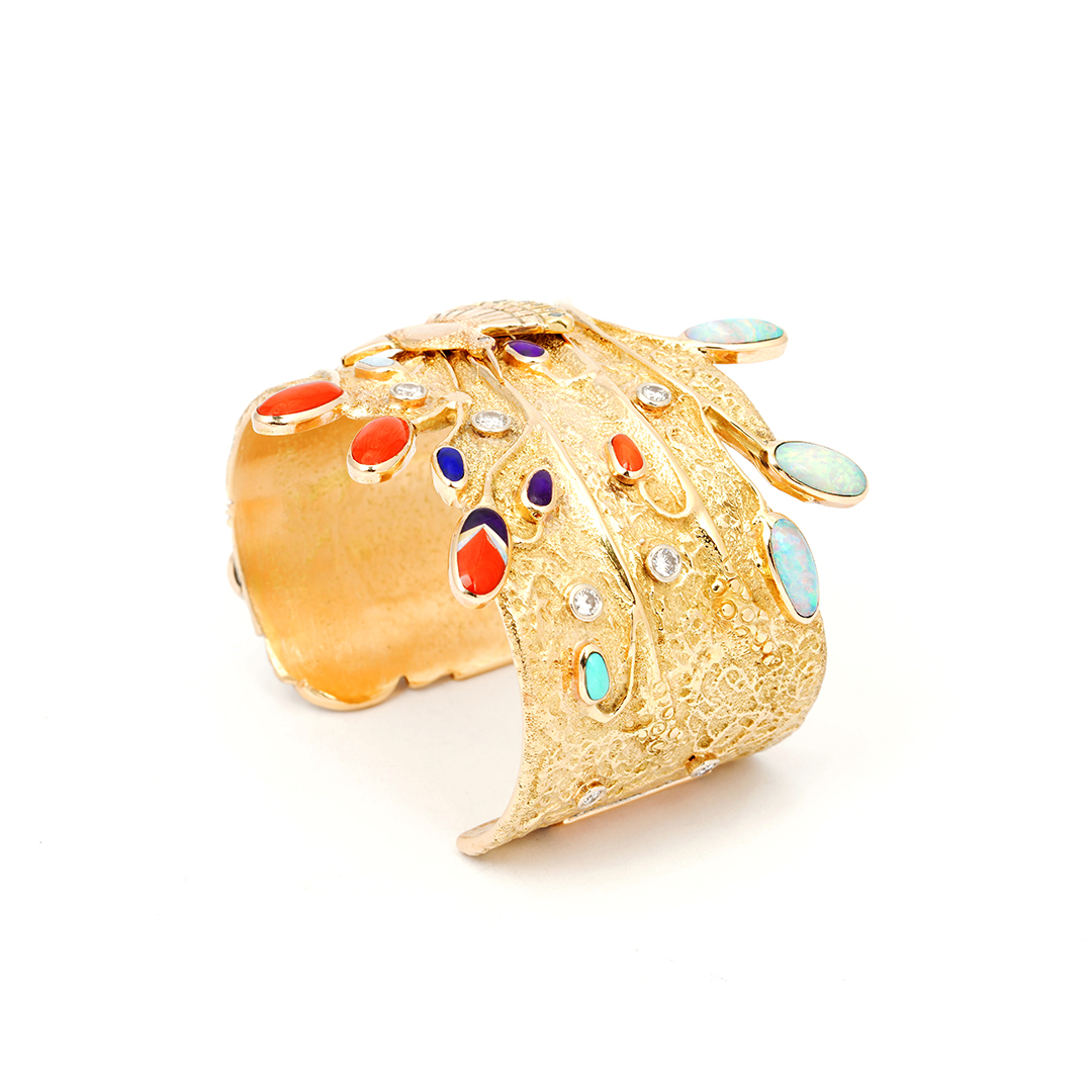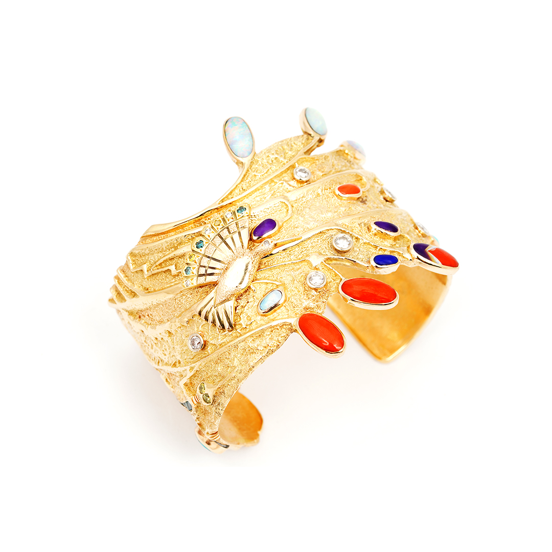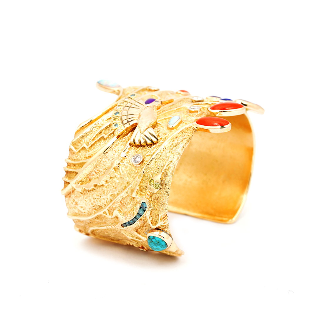 This 14k gold bracelet by renowned Navajo jeweler Jesse Monongya features a sculpted bird figure symbolizing transformation, with inlays of opal, coral, lapis, and sugilite set into textured tufa cast gold. A lizard motif adorned with blue sapphires accents the outer edge, showcasing Monongya’s masterful blend of Navajo tradition and contemporary elegance.
