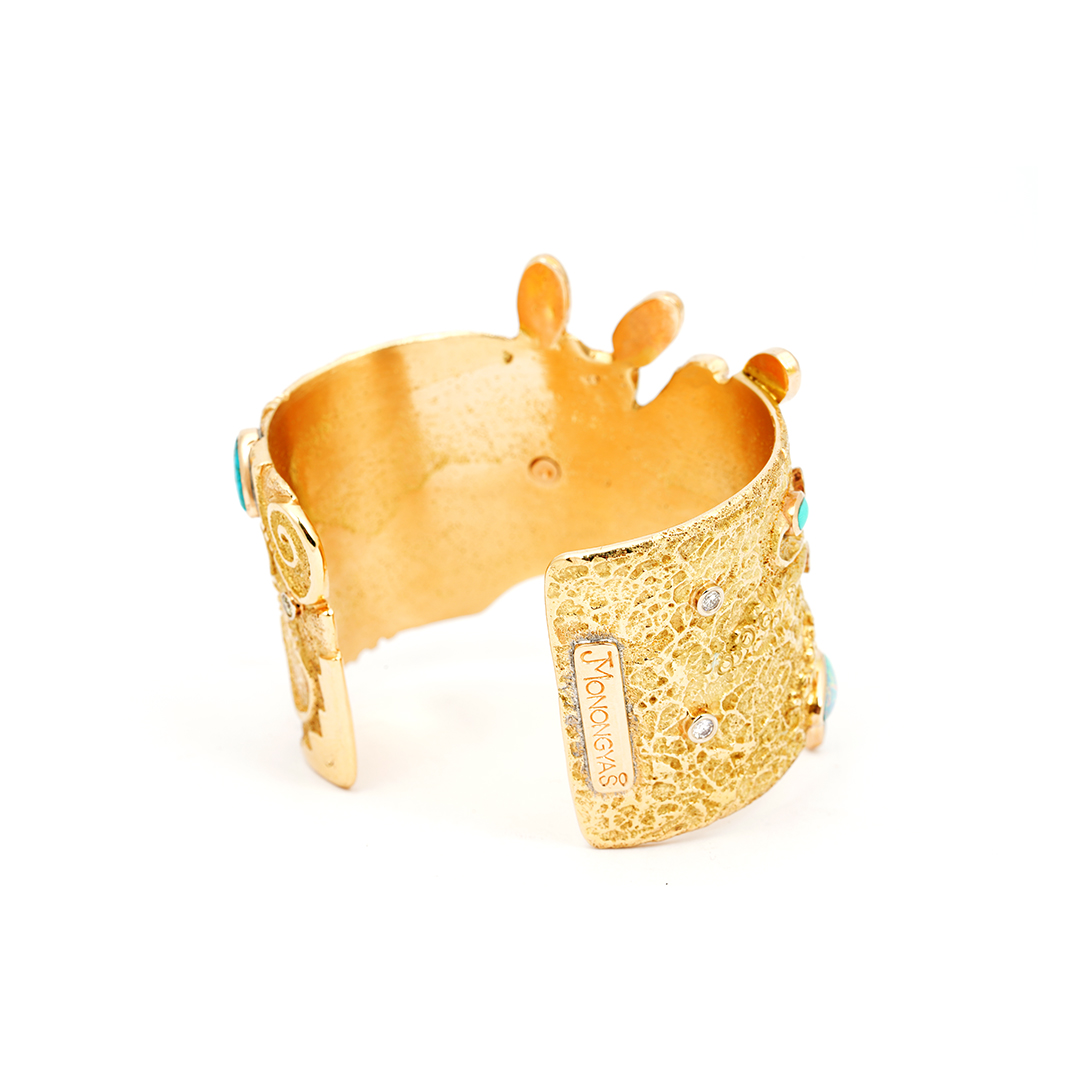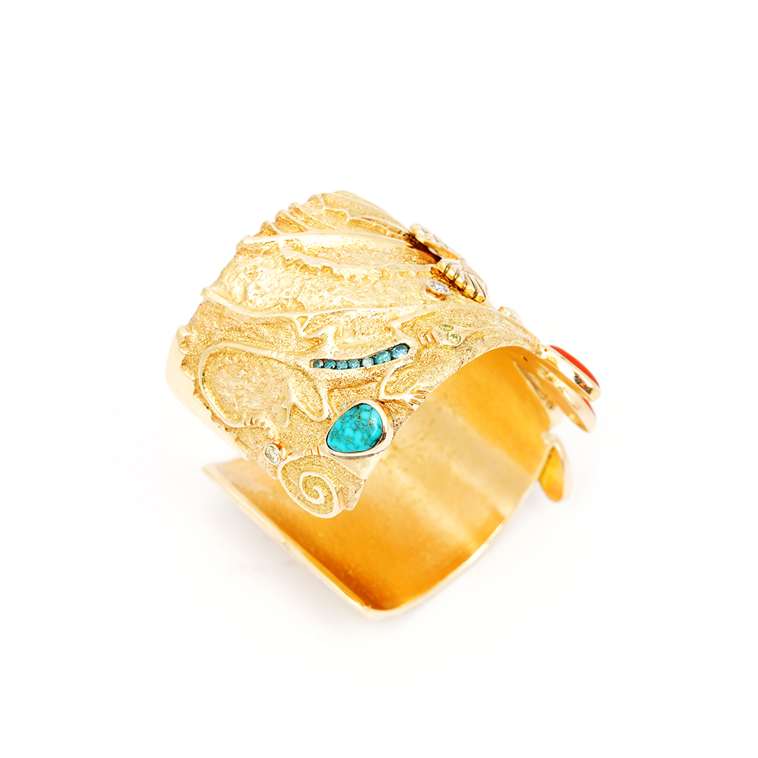 Monongya enhances the story further with a subtle tufa-carved lizard—an important symbol of survival and adaptability—set into the cast gold and accented with rich blue sapphires along the bracelet’s outer edge. The combination of materials, texture, and form creates an elegant balance between earth and sky, spirit and structure.