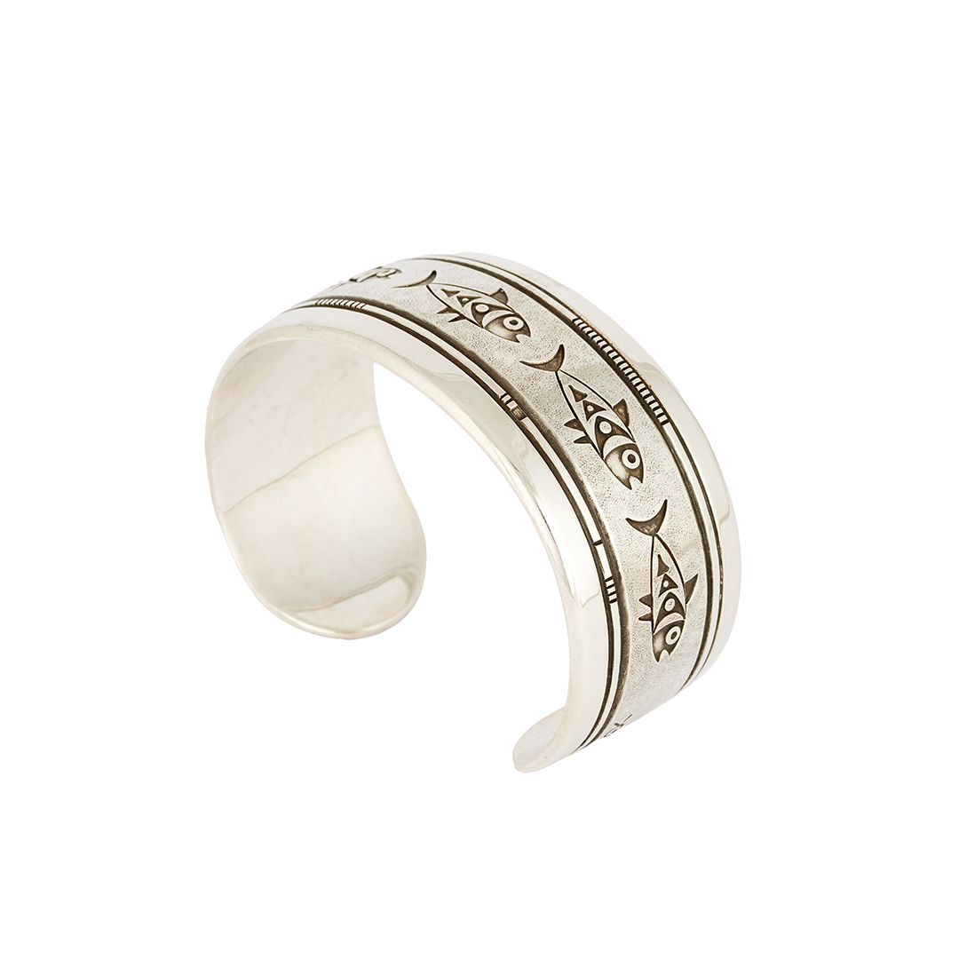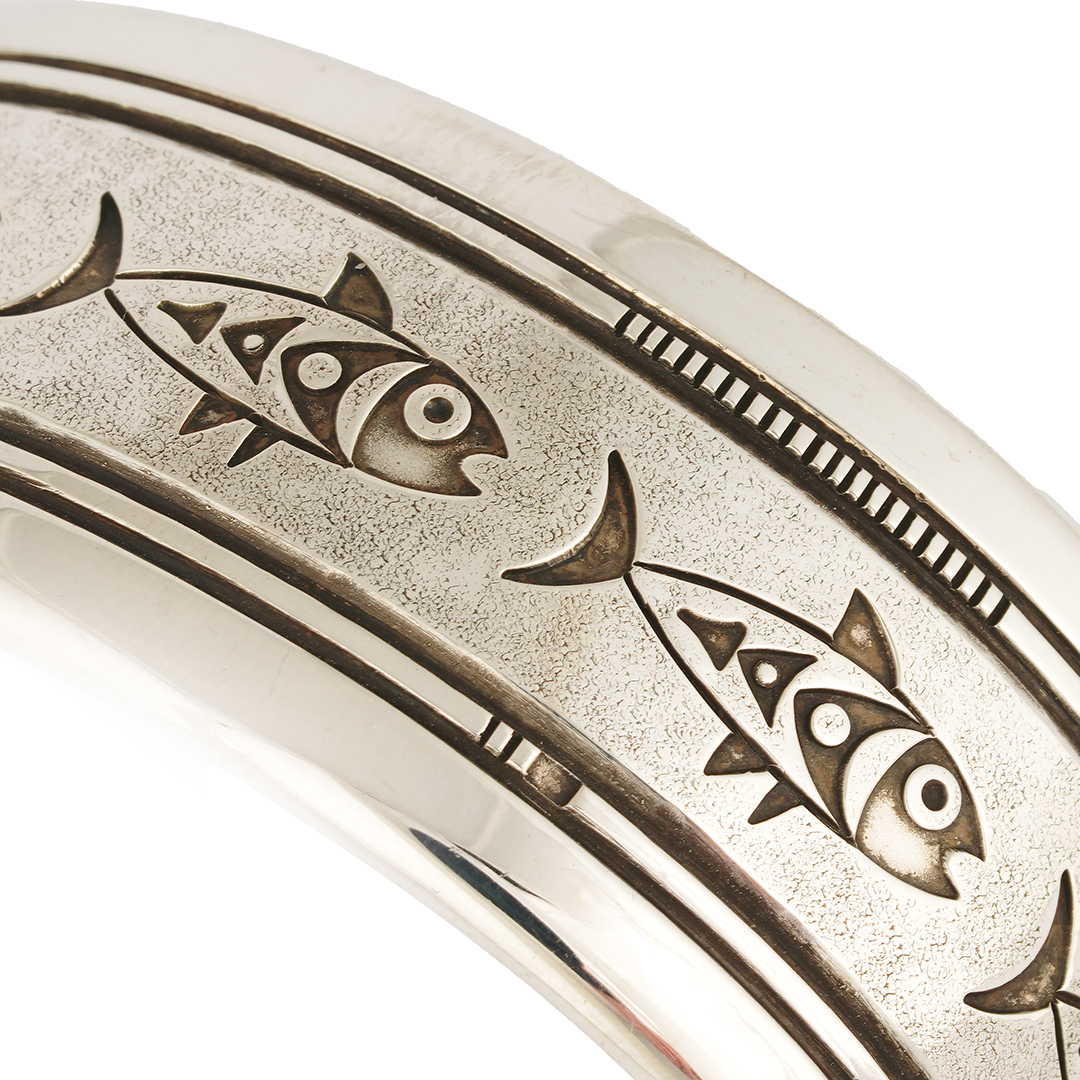 This bracelet by Norbert Peshlakia is made of sterling silver. He added a row of detailed hand stamp fish designs. Norbert is known for his award-winning stamps, which he creates and designs himself. Norbert’s contemporary style is worldwide and has been shown in multiple museums across the Southwest. The outer edges of this bracelet are polished, while the center with the fish design is satin and textured. He signed the side of this bracelet with his hallmark.