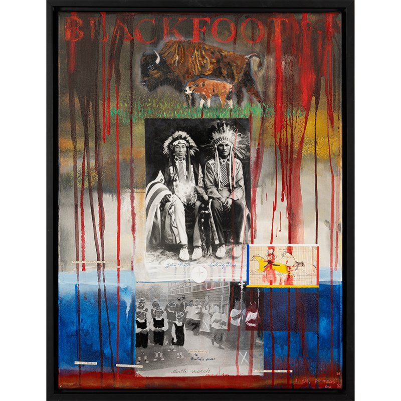 Poitras’ signature use of layered symbolism, historical photographs, and expressive abstraction invites viewers to confront the legacies of colonialism while honoring Indigenous resistance and revival.