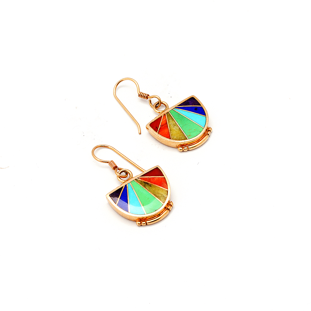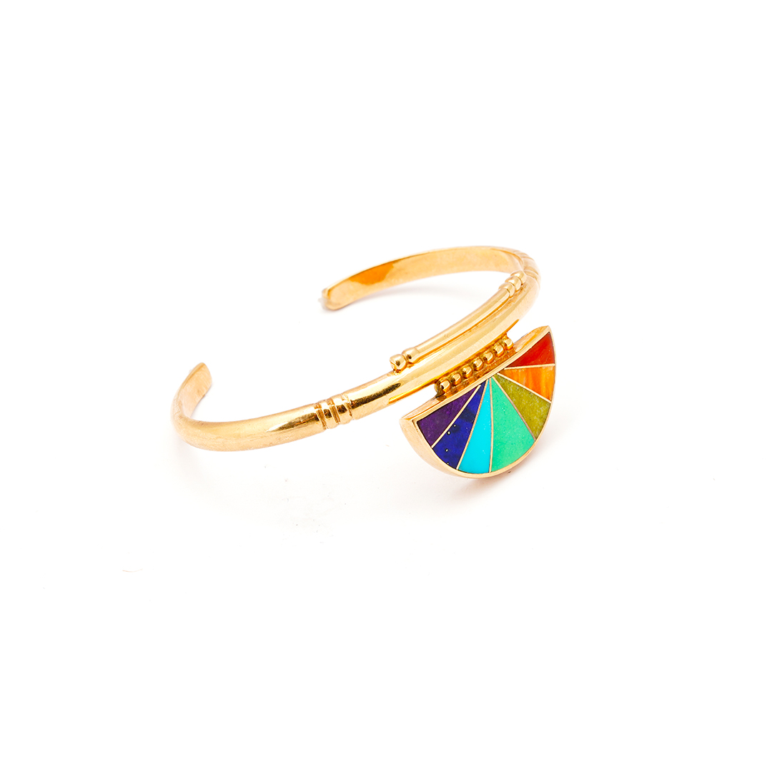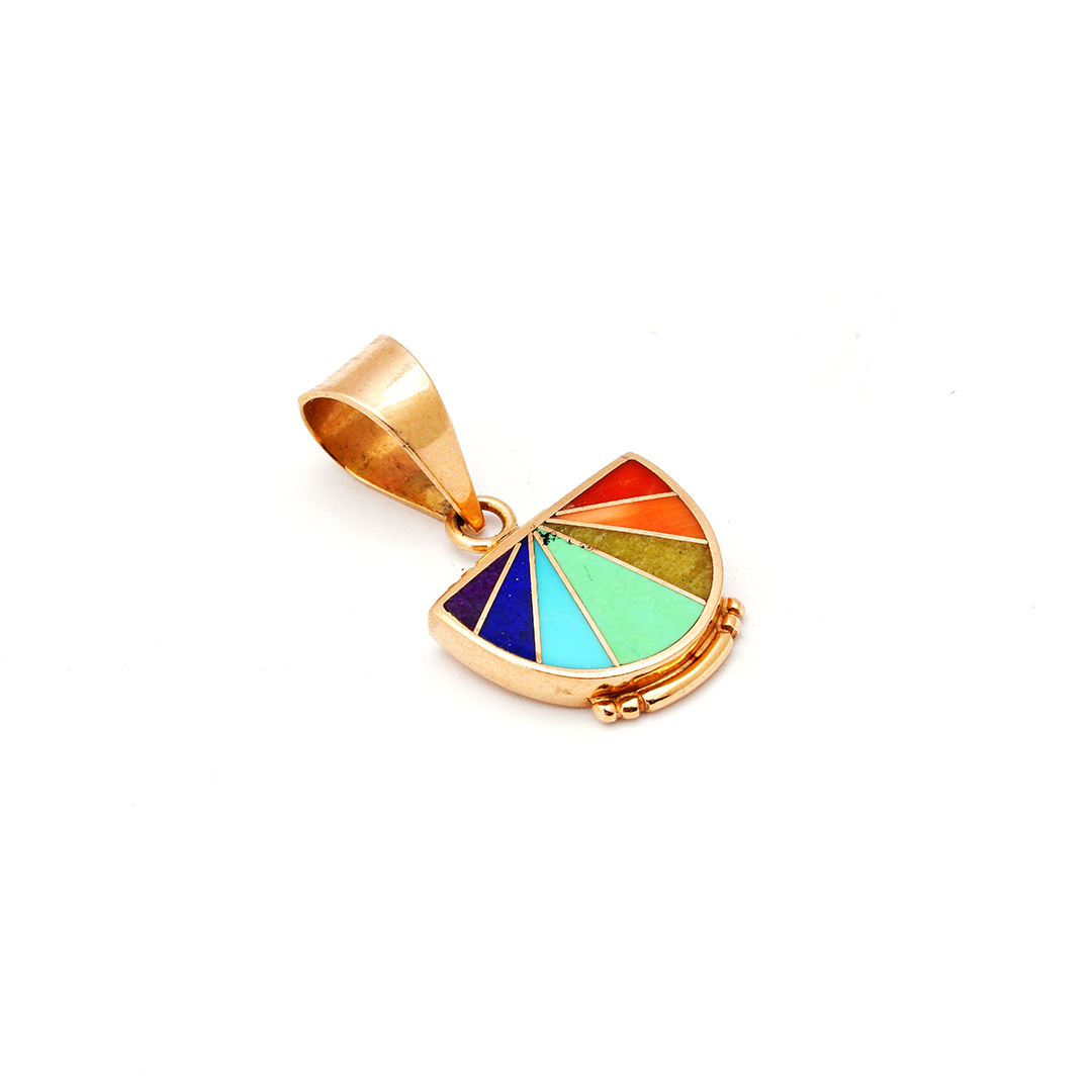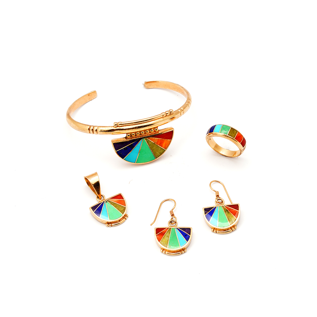 Navajo artist Ray Tracey set multi-colored rainbow colors in 14k gold jewelry. The inlay consists of lapis, turquoise, coral, sugilite, gaspeite, and serpentine, which is found in each piece: bracelet, earring, pendant, and ring. This unique set is Ray Tracy’s handmade jewelry line from the U.S.A.