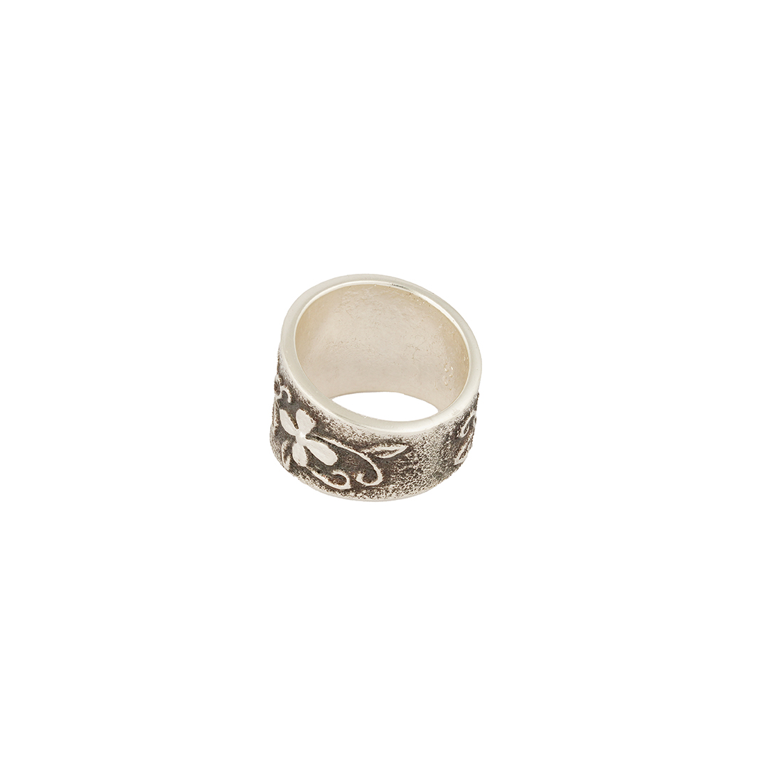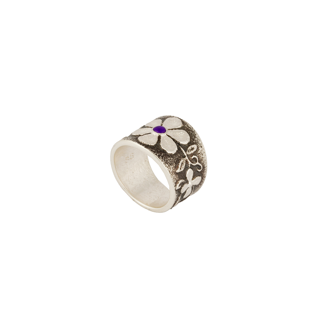 Navajo jeweler Rebecca Begay made this sterling silver tufa cast ring with a flower design and used a single sugilite stone.