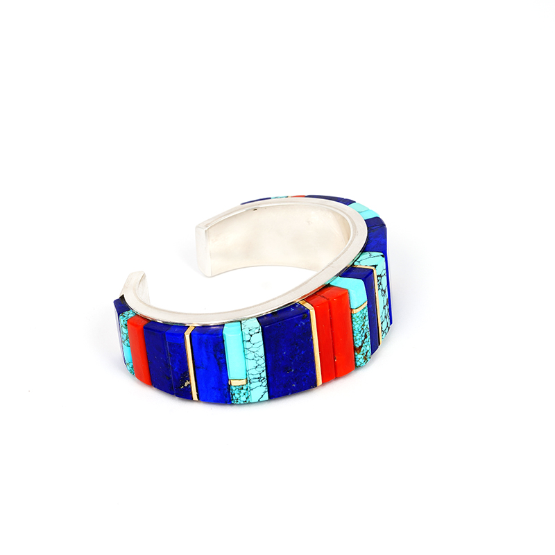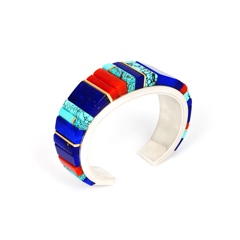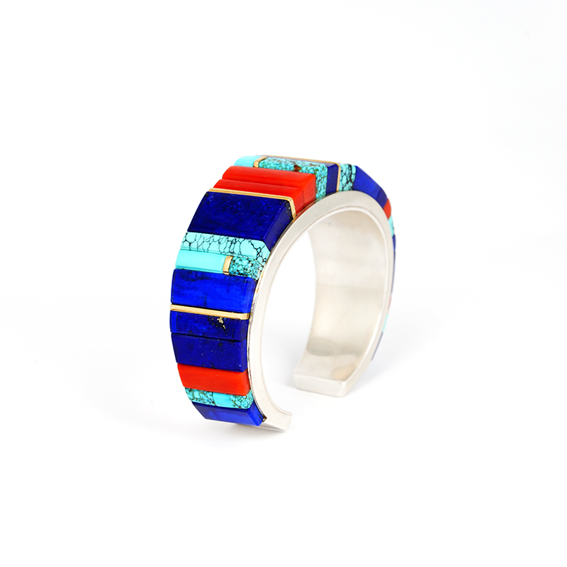 This exceptional cuff bracelet by renowned Hopi jeweler Sonwai (Verma Nequatewa) is a true masterwork of contemporary Native American jewelry. Handmade in sterling silver, the bracelet features a vibrant inlay of lapis lazuli, turquoise, red coral, and fine gold lines—each stone meticulously cut and inlaid.