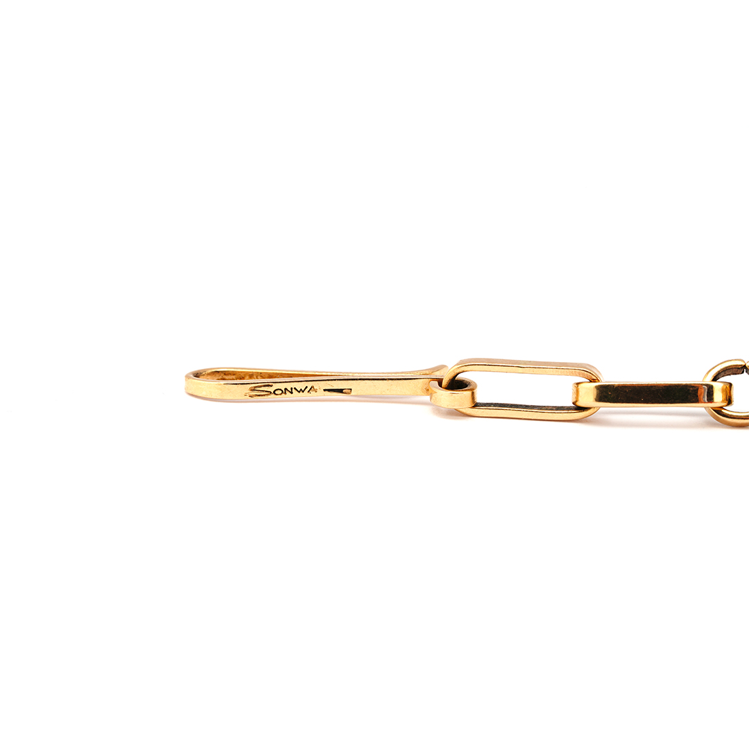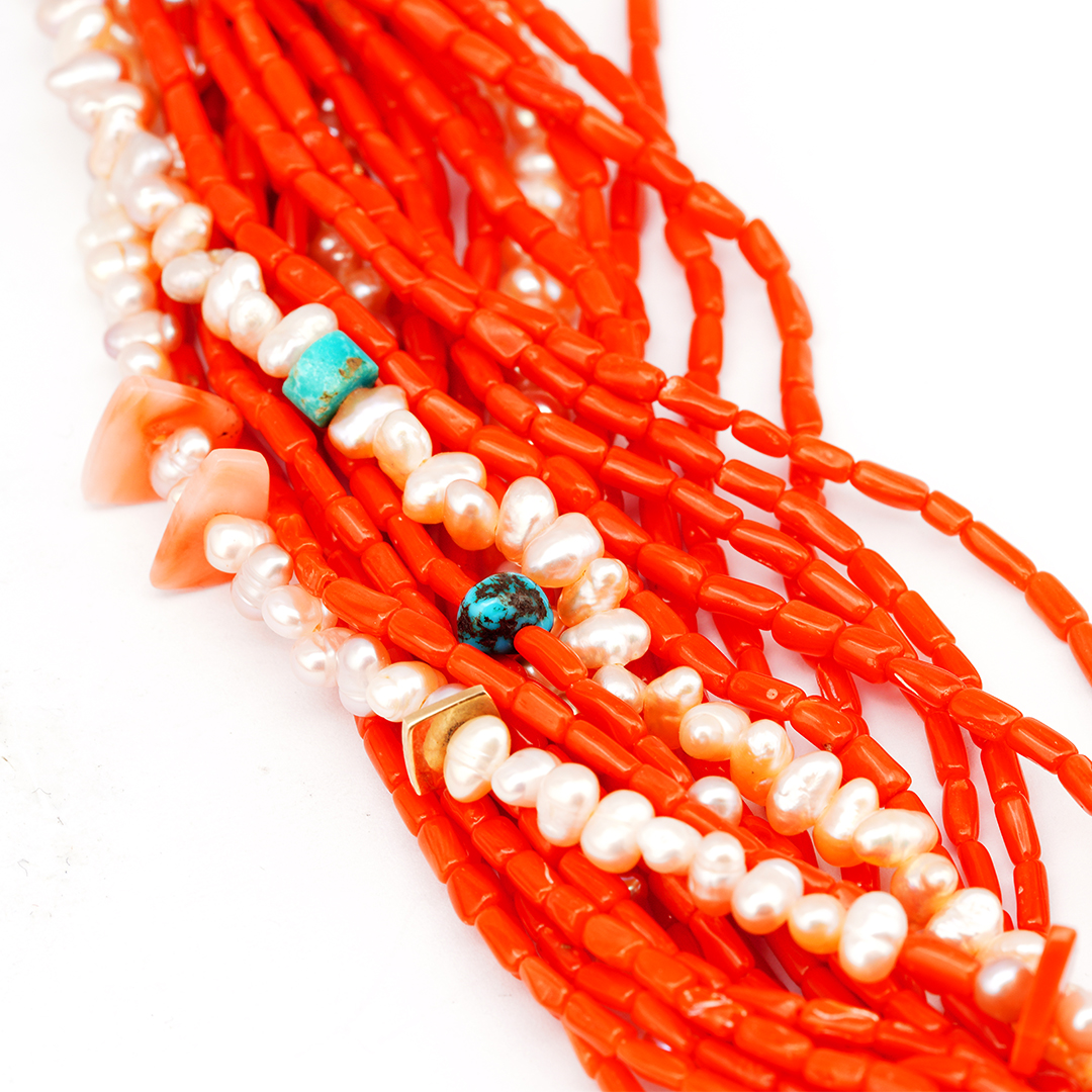 Nineteen strands of red Mediterranean coral beads beautifully accented by three strands of freshwater pearls by Master Hopi jeweler Sonwai (Verma Nequatewa). She accented throughout the strands pink coral, turquoise, and fine gold disk spacers. The 18k gold cones are handmade tufa cast with a morning star design, gold dots, and a single Lone Mountain turquoise stone. You can see Sonwai’s hallmark on the gold hook clasp. Today, Sonwai is still active at Hopi, continuing her uncle Charles Loloma’s traditions and their family history of making wearable art.