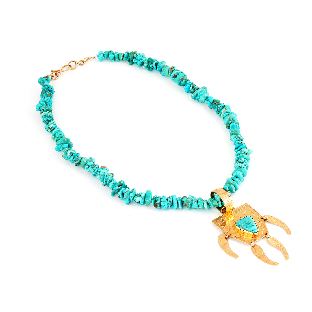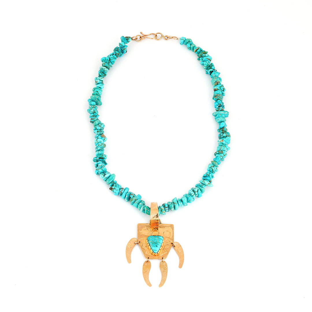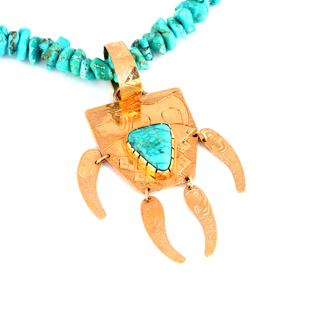 Terrance is from the Talhtan/Tlingit Nation. He has won multiple awards for his art, including jewelry, paintings, and cedar carvings. For the past 35 years, Terrance has combined Northwest Coast with Southwest designs like this 14k gold pendant on the Lone Mountain turquoise nugget necklace. Terrace added a bear design and four stylized gold bear claws that dangle off the pendant. On the bail, he said a mountain landscape design and, on the back, signed this piece “TAC.”