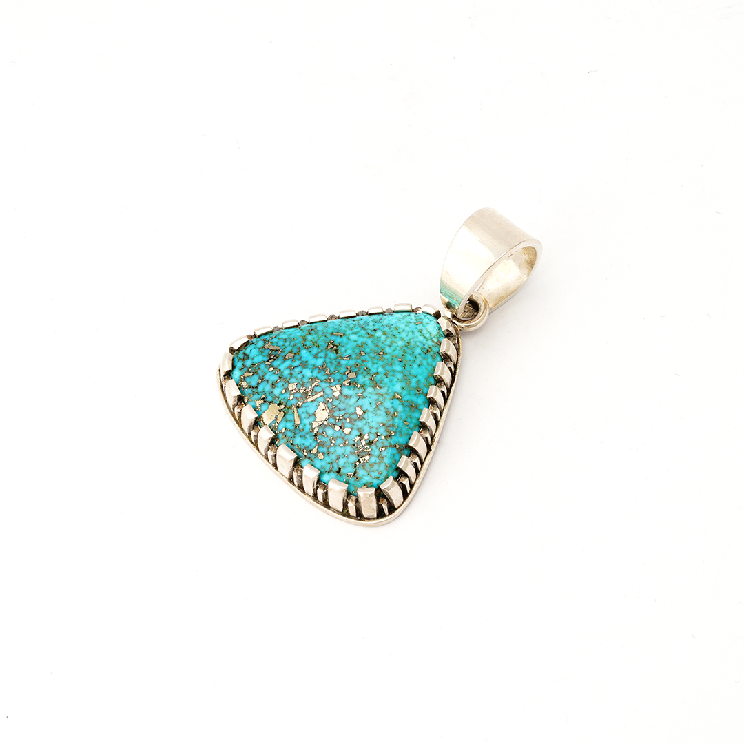 Tim Herrera is from Cochiti, Pueblo in New Mexico. He made this sterling silver pendant with serrated bezels and a large Persian Turquoise stone.