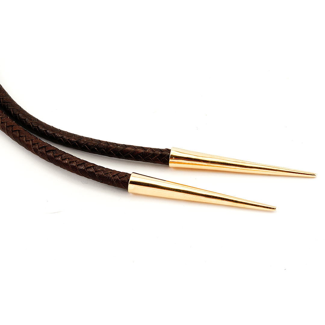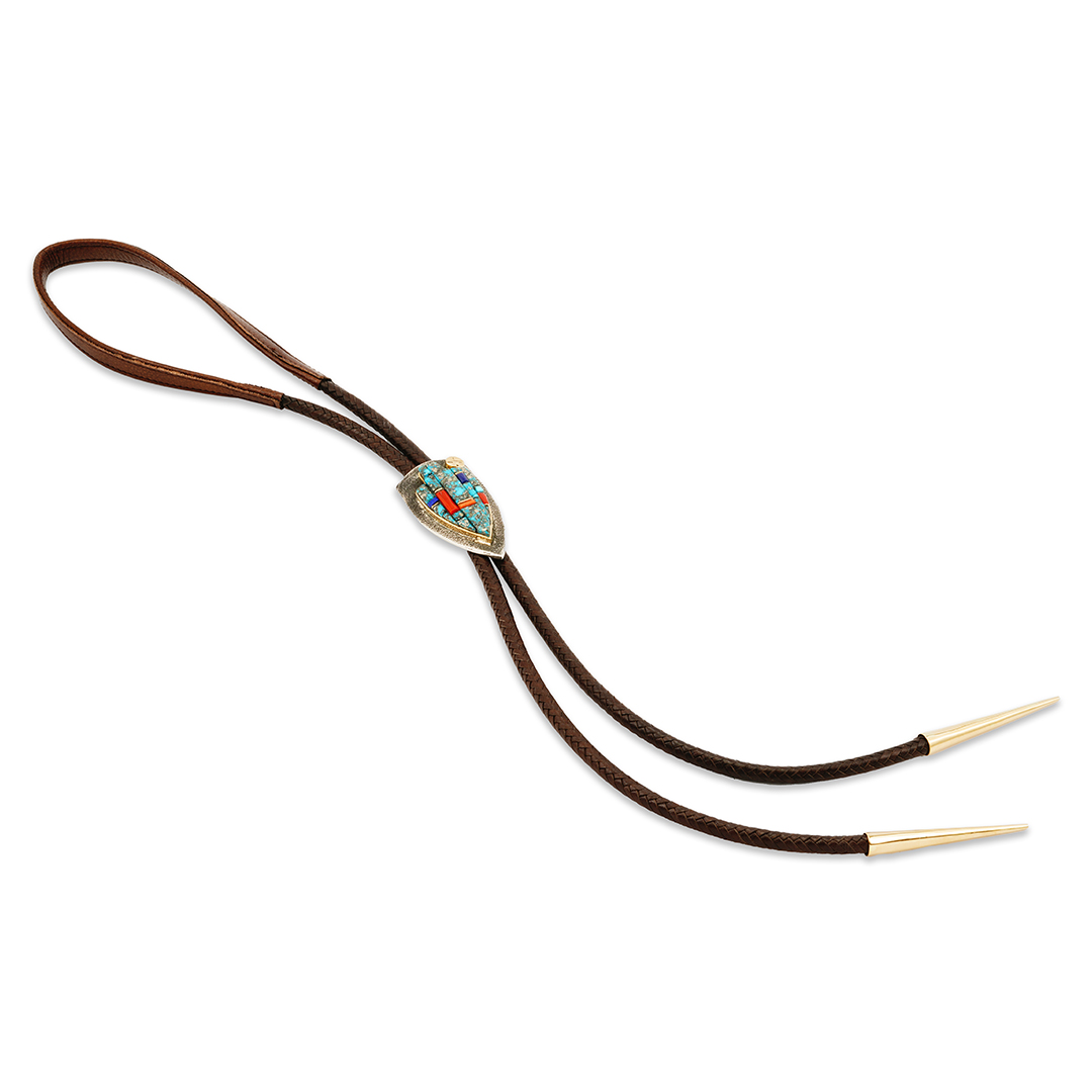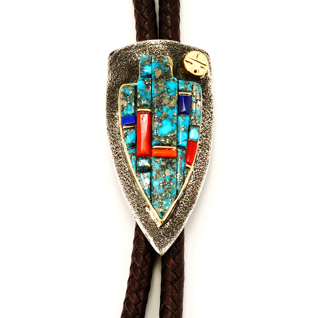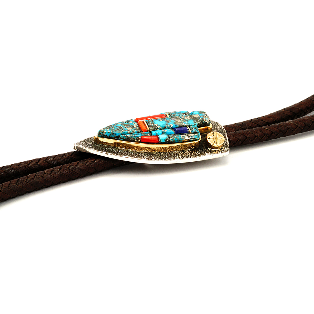 Navajo jeweler Wes Willie made this sterling silver tufa cast bolo tie. He inlaid this silver bolo with Gem-Quality Morenci turquoise, mediteranian coral, lapis, and fine-line gold bar accents. We set these stones in a gold bezel accented by a gold surface. This beautiful bolo is on a brown leather cord with gold tips.