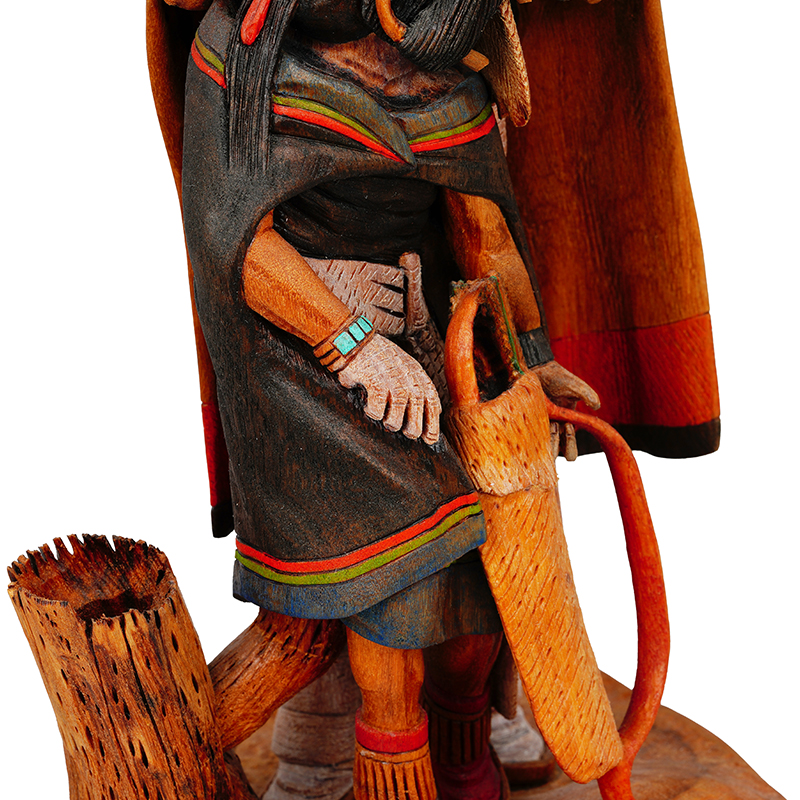 Hé-é-e, also known as the Warrior Maid, appears most often during Powamu, but her most powerful role is during the Pachavu ceremonies. She’s based on a traditional story about a young Hopi girl who saw enemies approaching the village while her mother was styling her hair. With one side still undone, the girl grabbed a bow, arrows, and quiver, and ran to warn the village. She held the line until the men returned, and from then on, she was remembered through this kachina figure.